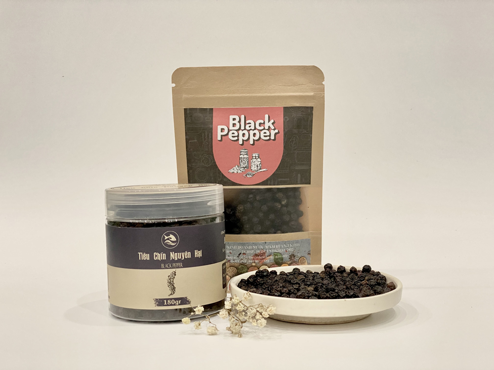 Tiêu đen nguyên hạt là một loại gia vị được lựa chọn và thu hái cẩn thận từ hạt tiêu chín đỏ, sau đó được sấy khô tỉ mỉ, trước khi được đóng gói giữ nguyên hạt. Hạt tiêu sẽ có màu đen và có hương vị cay nồng, thậm chí hơi ngọt. Đây là loại gia vị quen thuộc được sử dụng trong các bữa ăn của gia đình Việt, cũng là một loại gia vị không thể thiếu khi chúng ta muốn món ăn của mình trở nên ngon hơn.