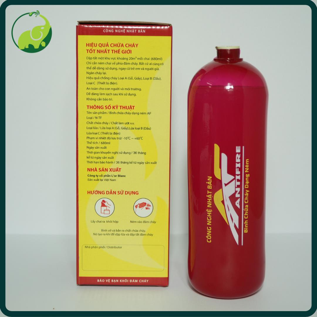 Bình chữa cháy dạng ném AF không cần các thao tác sử dụng phức tạp, có thể được sử dụng bới bất cứ người nào. Sản phẩm có ích khi sử dụng trong hộ gia đình, văn phòng cơ quan, kho xưởng ..., xin vui lòng liên hệ chúng tôi để được hướng dẫn sử dụng trong các trường hợp đặc biệt. Sản phẩm nhẹ (680 ml), nhỏ gọn và không cần các thao tác phức tạp, chỉ đơn giản ném thẳng bình vào đám cháy.