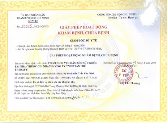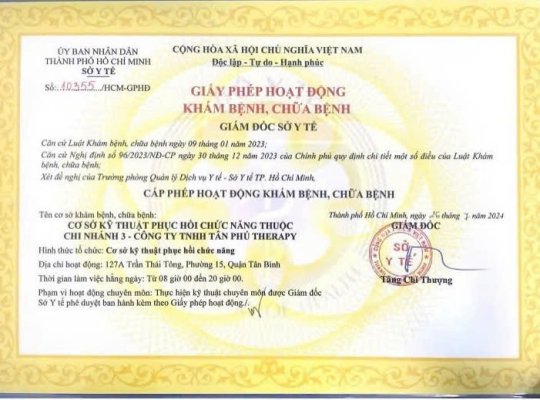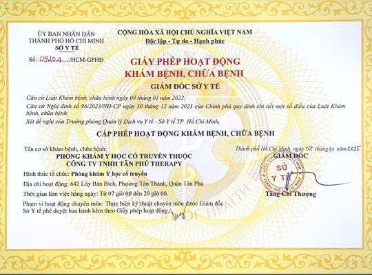 PHÒNG KHÁM TÂN PHÚ THERAPY có 03 cơ sở đang hoạt động tại Quận Tân Phú, Quận Tân Bình và Bình Tân, đã được Sở y tế TPHCM cấp phép hoạt động đồng thời xác nhận nội dung quảng cáo trên Internet. Với các chuyên khoa Y học cổ truyền - Vật lý trị liệu, Cơ sở Phục Hồi Chức Năng và Dịch vụ Điều trị Vật lý trị liệu tại nhà.