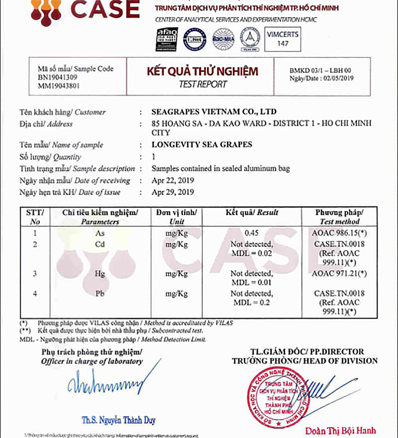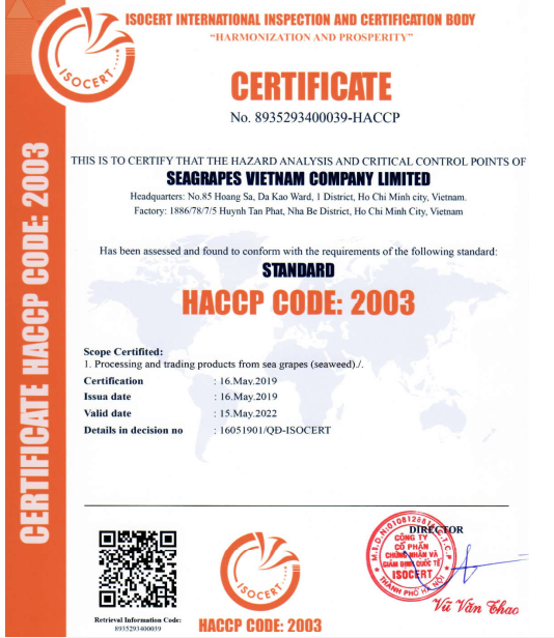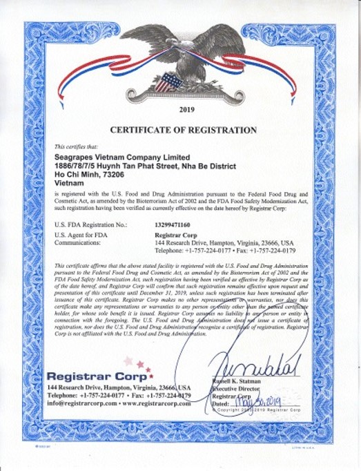 - Đạt chuẩn Hoa Kỳ: Chất lượng rong nho đạt tiêu chuẩn xuất khẩu vào các thị trường khó tính nhất như: Mỹ, Nhật, Châu Âu. Bạn hoàn toàn yên tâm.