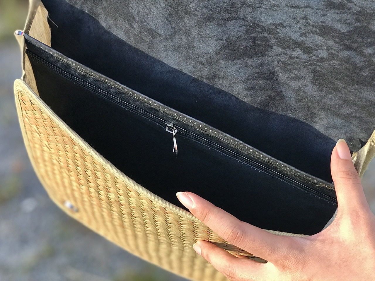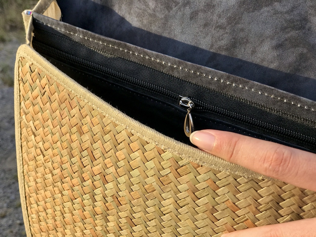 - Lớp bên ngoài được đan chắc chắn bằng cỏ bàng, những đường đan chi tiết tỉ mỉ, được làm thủ công bởi các nghệ nhân là người dân địa phương. Vì lớp ngoài là lớp cỏ khô nên nó rắn chắc, đàn hồi tốt, được thiết kế để làm bộ khung cho giỏ. Đường chỉ may ngay ngắn, ngăn nắp, đồng đều. Màu chỉ được lựa chọn, hài hoà với tổng thể màu của giỏ, không bị chõi màu. Cho nên, lớp vỏ ngoài của balo được ví như người phụ nữ Việt Nam rắn rỏi, bất khuất.