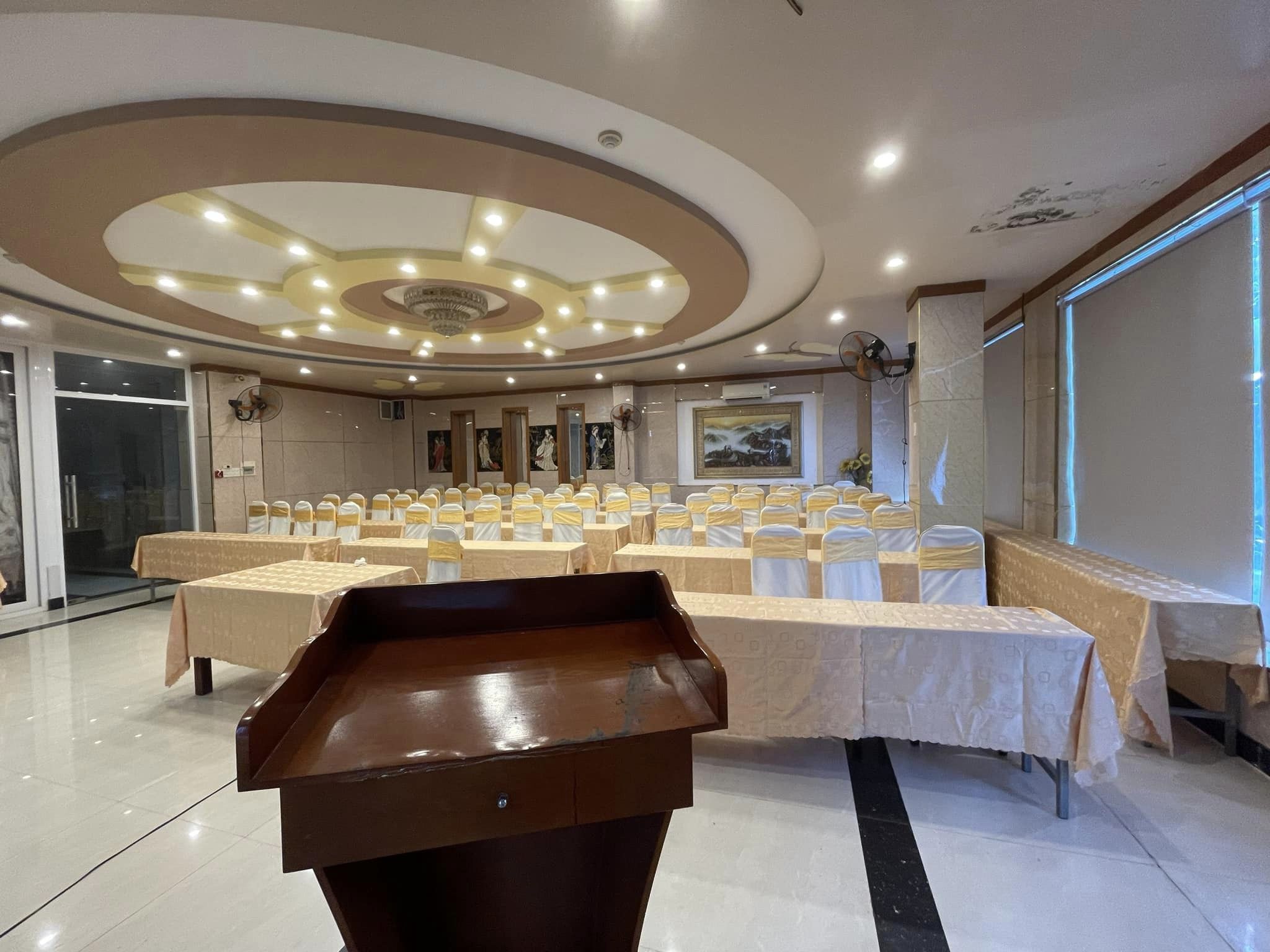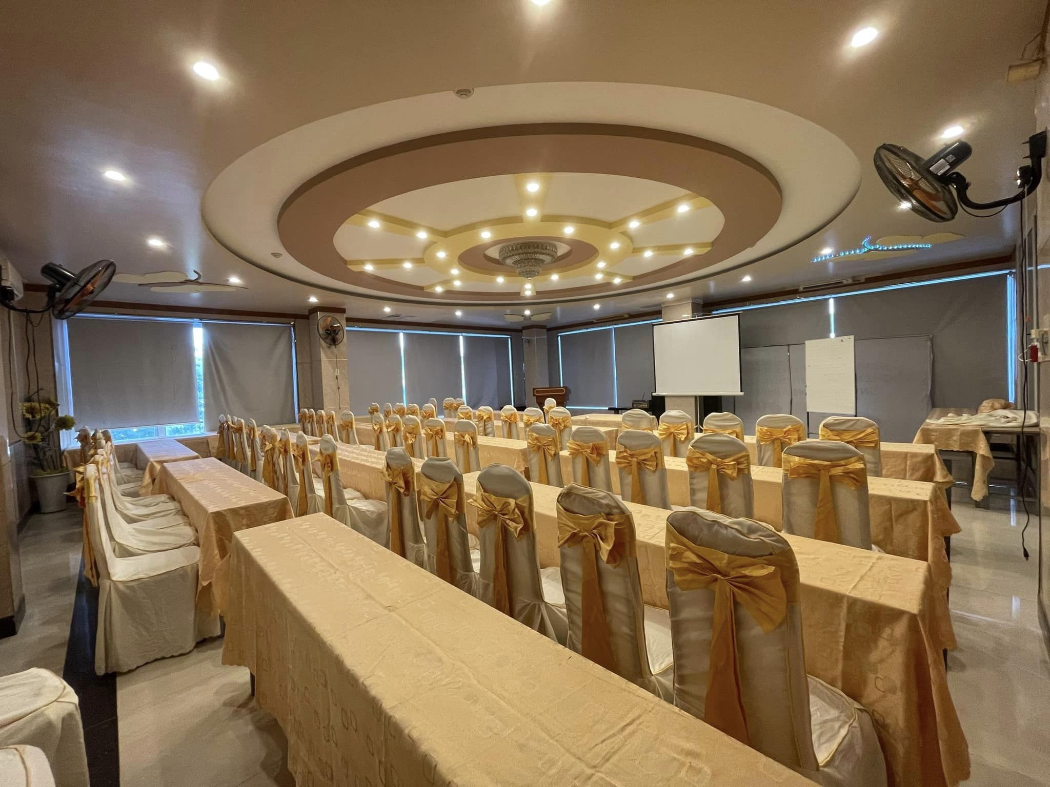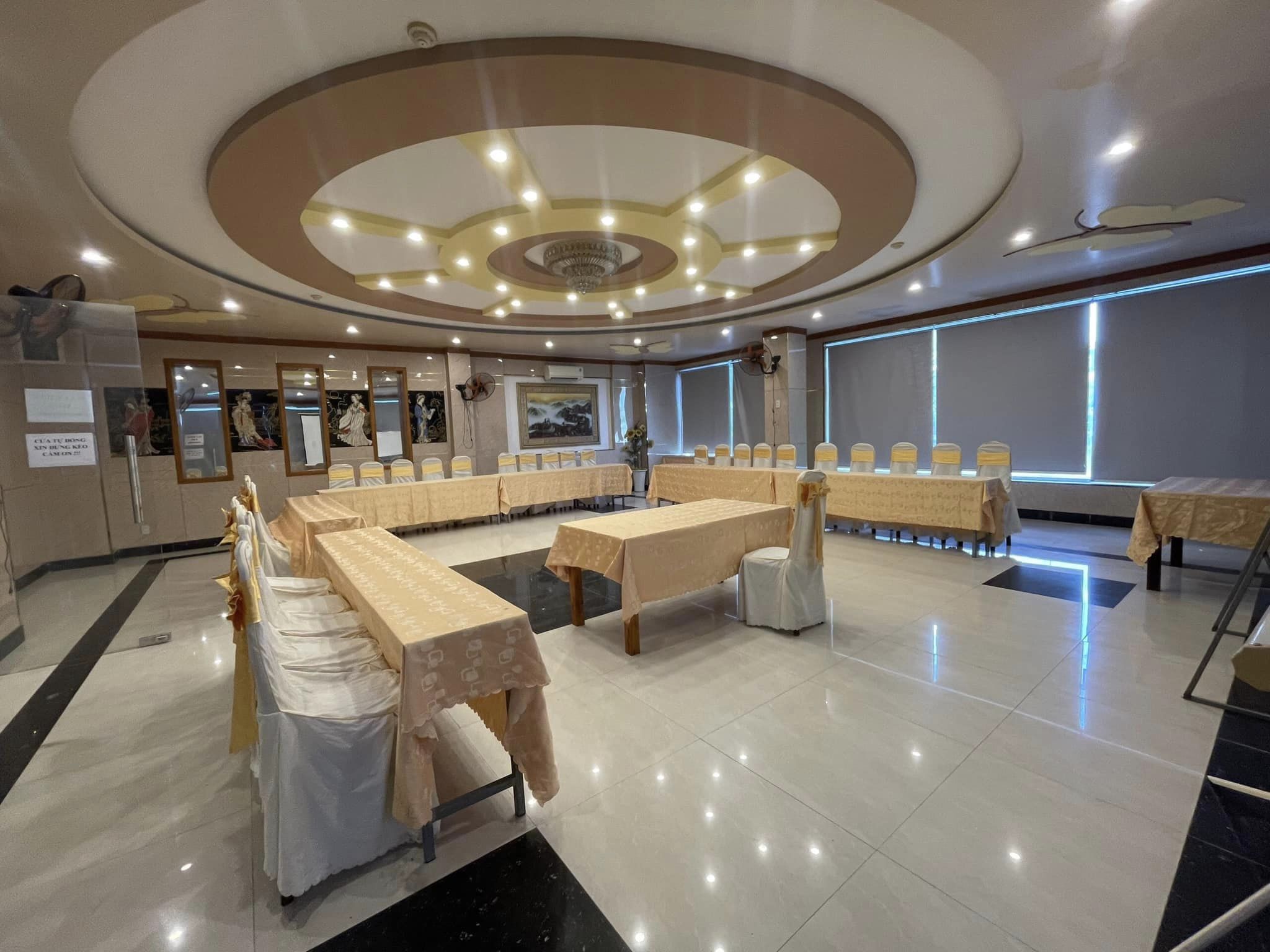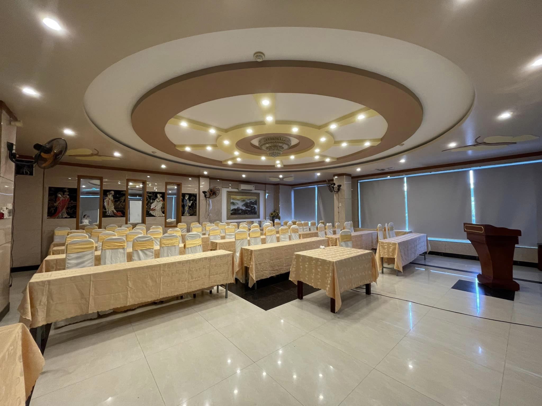Thiết bị hiện đại: Để đảm bảo mọi sự kiện diễn ra một cách suôn sẻ, sảnh hội nghị được trang bị đầy đủ thiết bị âm thanh, ánh sáng và trình chiếu hiện đại nhất, bao gồm cả máy chiếu, màn hình LED, micro, và hệ thống âm thanh chất lượng.