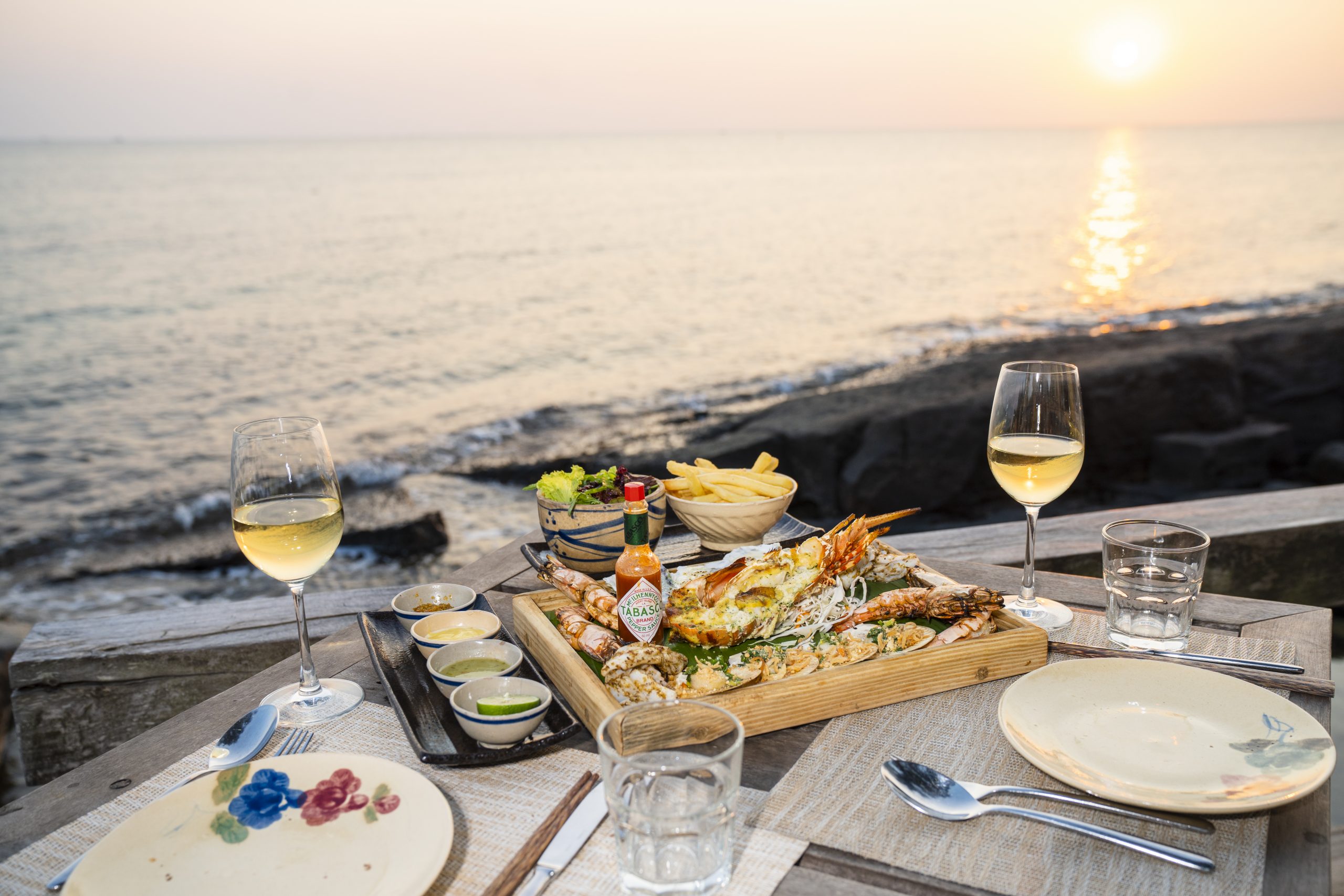Nhà hàng On the Rock tọa lạc tại địa điểm ngắm hoàng hôn tuyệt vời bên rìa đại dương. Ngày qua đêm xuống, bầu trời vàng óng từ từ tan biến để lộ ra những vì sao, ai đó có thể nói rằng đây là một trong những nơi lãng mạn nhất ở Việt Nam. Giữa không gian đơn giản, đây là nơi hoàn hảo để khám phá lại những gì tinh túy nhất của ẩm thực, rượu ngon và một quang cảnh đẹp.
