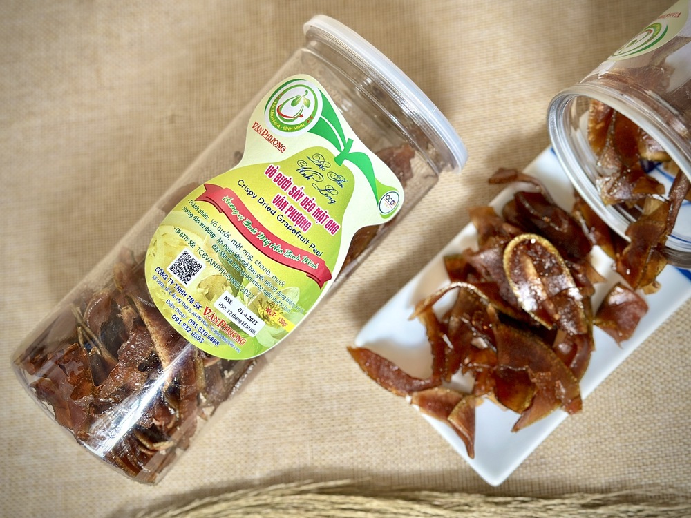 Vỏ bưởi sấy dẻo mật ong, một món ăn vặt ngon miệng, dễ làm và có nhiều công dụng tốt cho sức khỏe. Vỏ bưởi sấy dẻo mật ong có hương vị ngọt thanh, thơm mật ong và cay the của bưởi, rất hấp dẫn và cuốn hút. Vỏ bưởi sấy dẻo mật ong còn chứa nhiều vitamin C, chất xơ, chất chống oxy hóa, tinh dầu và các chất khoáng chất, giúp giảm cân, hỗ trợ điều trị ho, làm đẹp da, khỏe dáng, giảm mỡ trong gan, điều trị khó tiêu, đầy bụng…