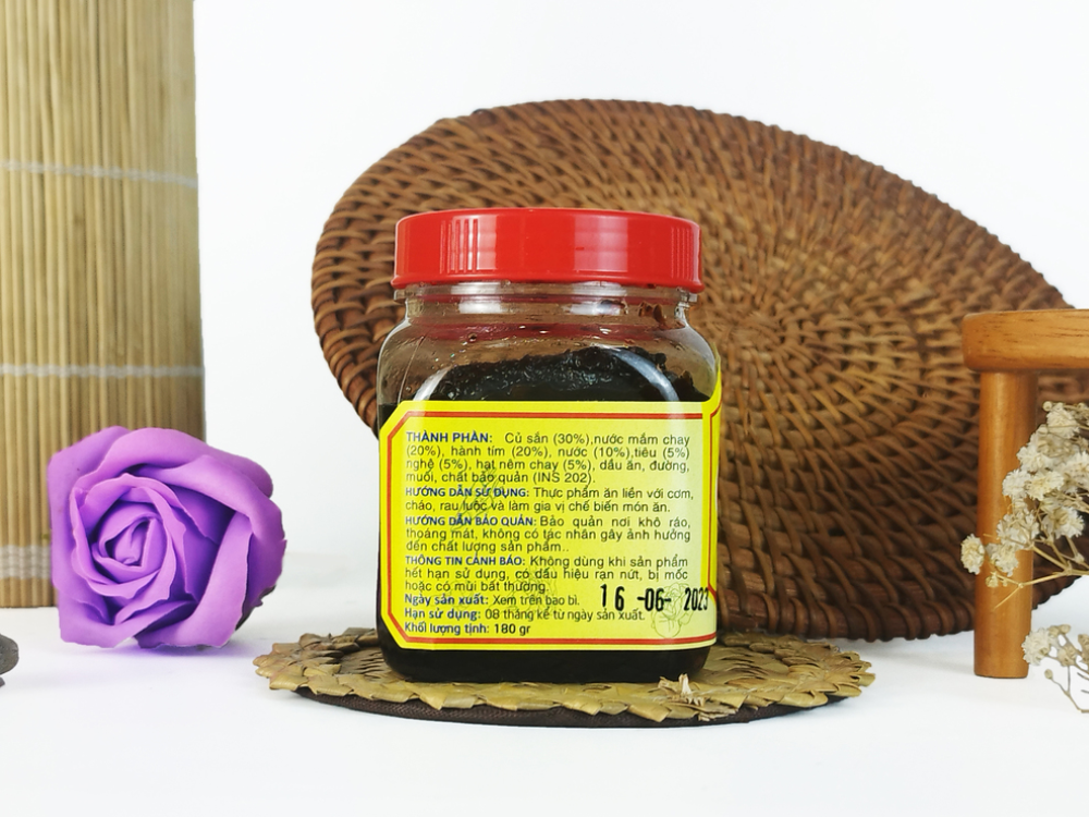- Thành phần: Củ sắn, nước mắm chay, hành tím, tiêu, nghệ, dầu ăn, đường, muối, nước, chất bảo quản.