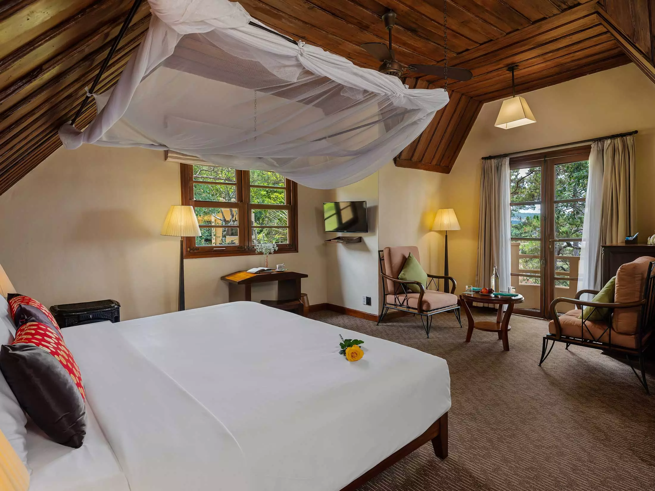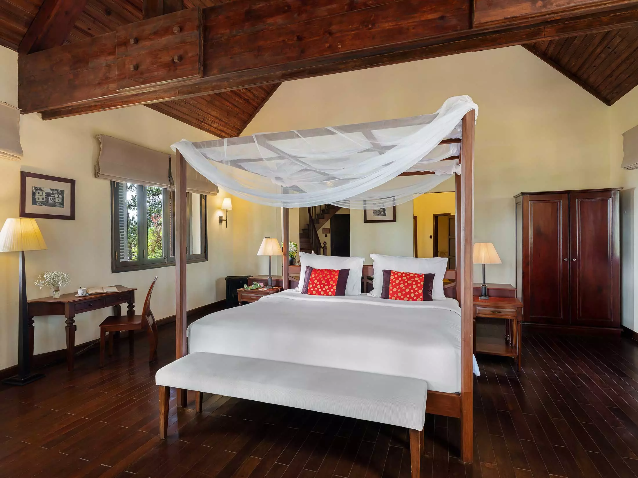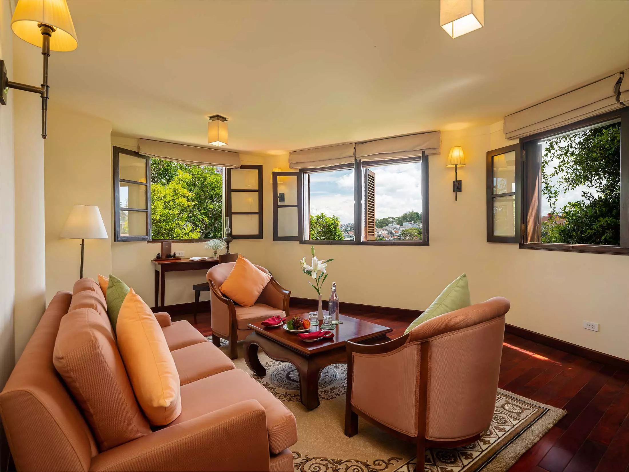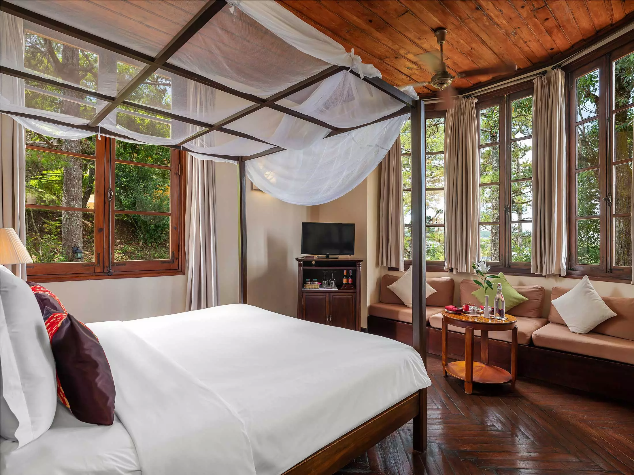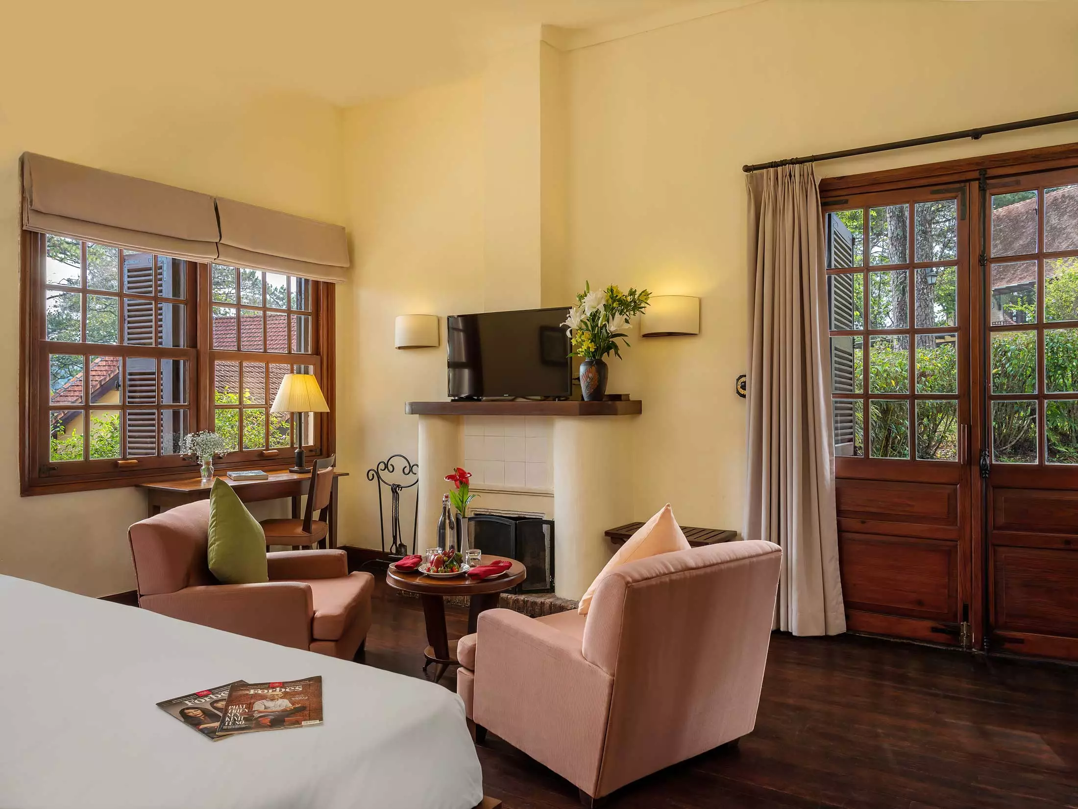 Tranh treo tường xưa cổ, đồ nội thất trang nhã và các vật dụng được sưu tầm theo phong cách Đông Dương trong 28 căn Villa Suite sẽ đưa Quý khách ngược thời gian về Đà Lạt thời Pháp thuộc. Giường King được đặt trên nền sàn gỗ gụ tự nhiên, hứa hẹn một giấc ngủ ngon trong tiết trời mát mẻ tại Đà Lạt dành cho 02 người lớn và 01 trẻ em dưới 6 tuổi.