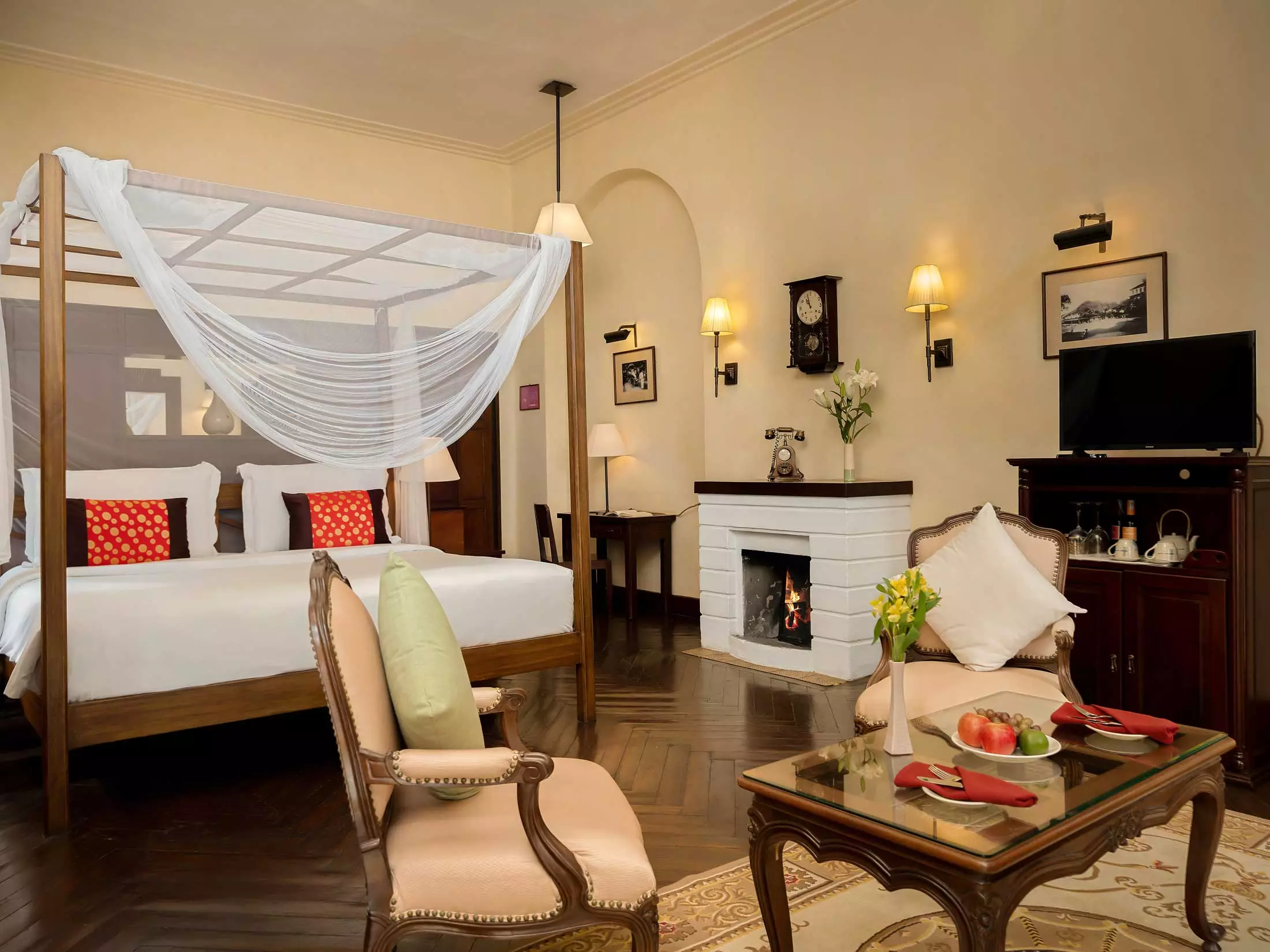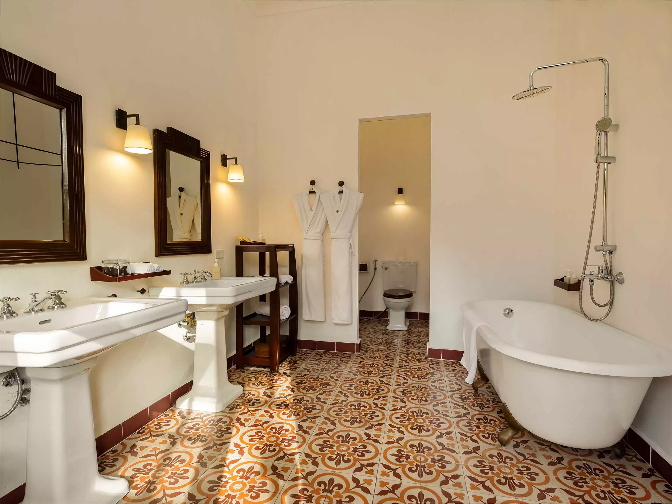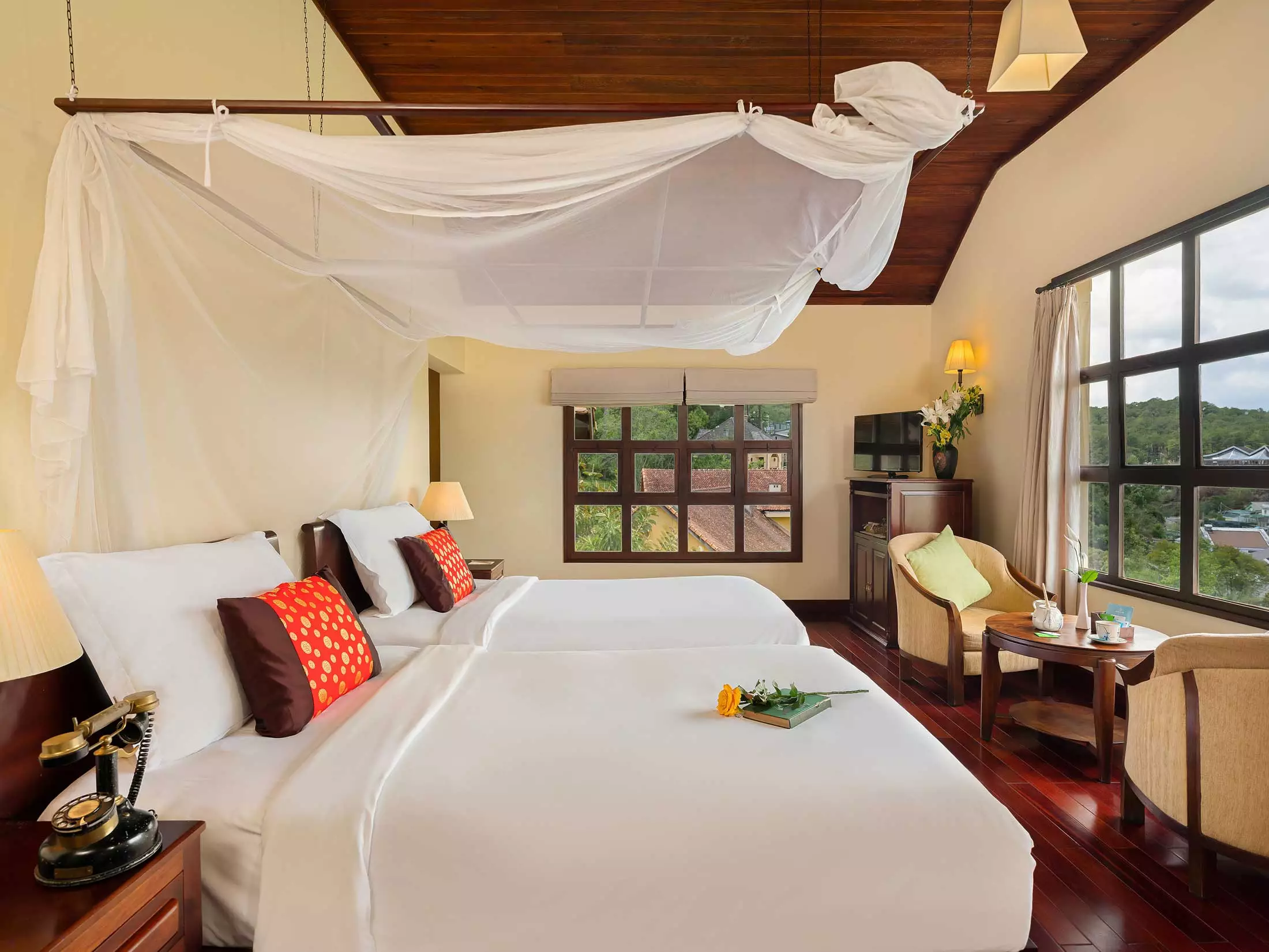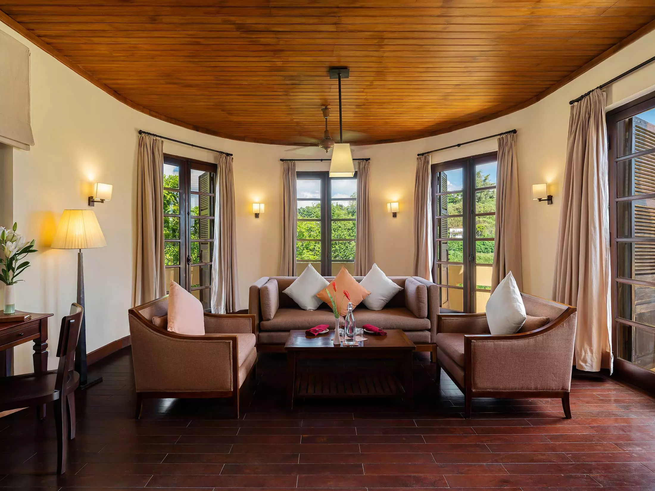 Chiếc giường tứ trụ truyền thống, phòng khách rộng rãi và đồ nội thất được thiết kế riêng biệt theo kiểu Đông Dương – tất cả tạo nên sự trang nhã nhẹ nhàng, lôi cuốn trong 3 căn Grande Suite với tầm nhìn tuyệt đẹp từ ban công riêng. Phòng tắm rộng rãi giúp Quý khách thư giãn với bồn tắm chân đế cổ điển và khu vực tắm vòi sen riêng biệt. Phòng Grande Suite là nơi nghỉ ngơi lý tưởng cho 02 người lớn và 01 trẻ em dưới 6 tuổi.