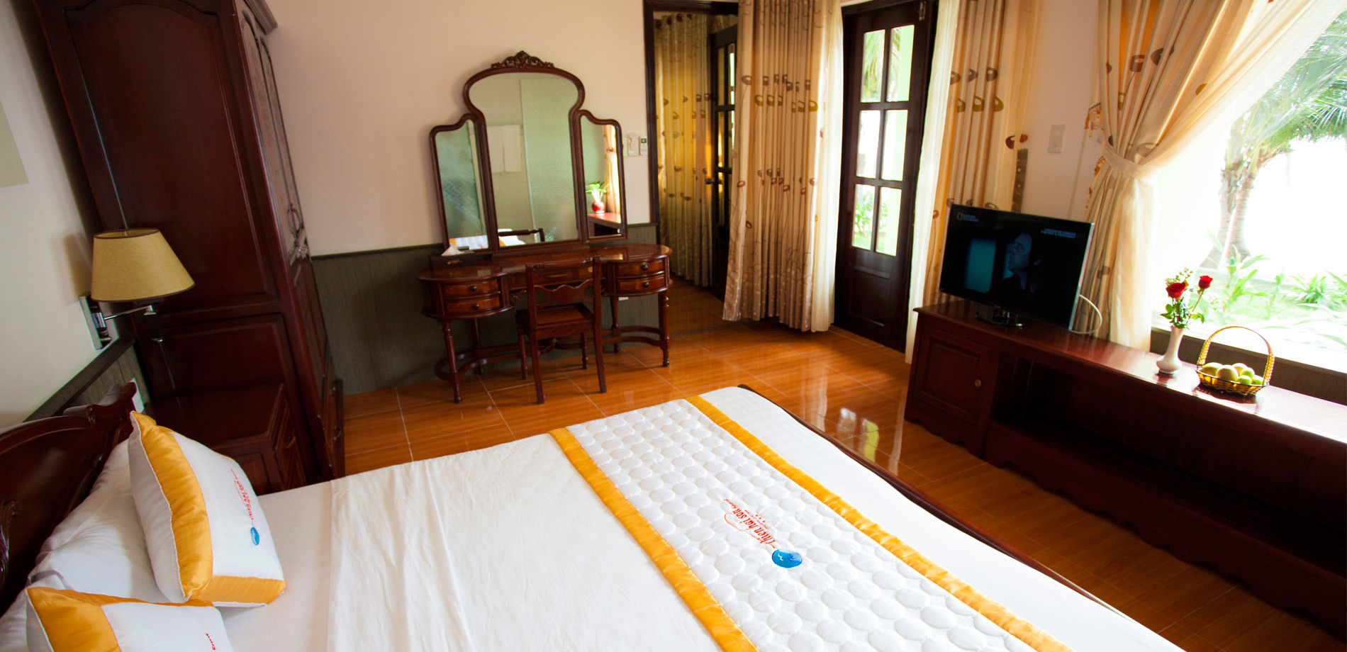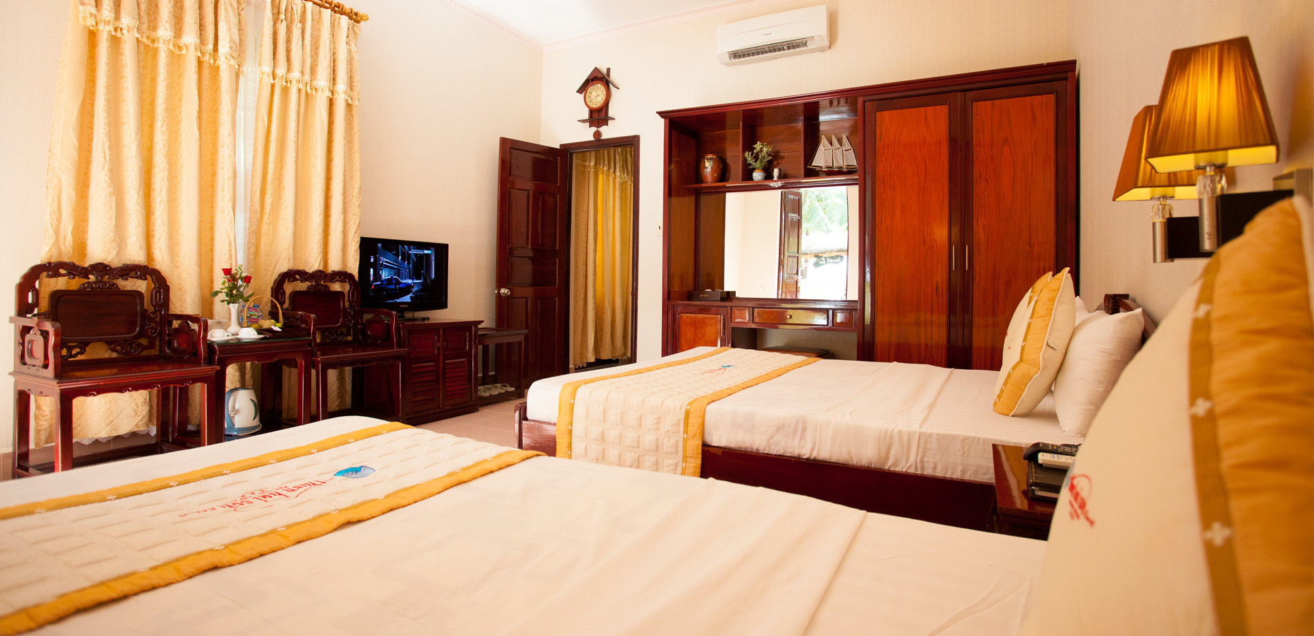 Hệ thống phòng nghỉ với 100 phòng đạt tiêu chuẩn 3 sao. Bao gồm 43 phòng khách sạn, 30 phòng biệt thự hướng biển, 10 phòng biệt thự sát biển và 1 cụm khách sạn 15 phòng sát biển và 02 phòng VIP. Tất cả các phòng đều có ban công riêng và được trang bị các tiện nghi vật dung đạt tiêu chuẩn 3 sao.