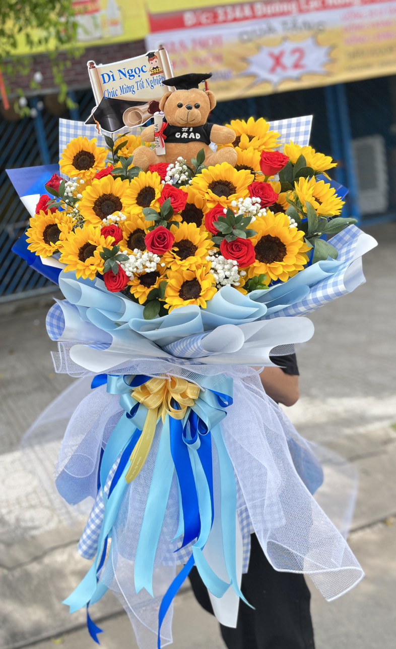 Bó hoa chúc mừng tốt nghiệp kèm gấu to rực rỡ