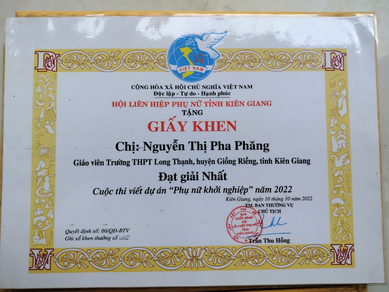 - Giải nhất Cuộc thi viết Dự án khởi nghiệp của Hội phụ nữ tỉnh Kiên Giang tổ chức năm 2022.