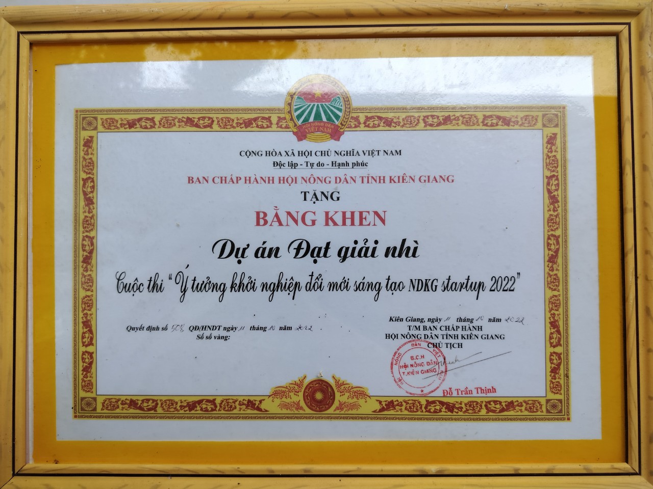 - Giải nhì Hội Nông dân tỉnh Kiên Giang về cuộc thi Khởi nghiệp Nông nghiệp năm 2022.