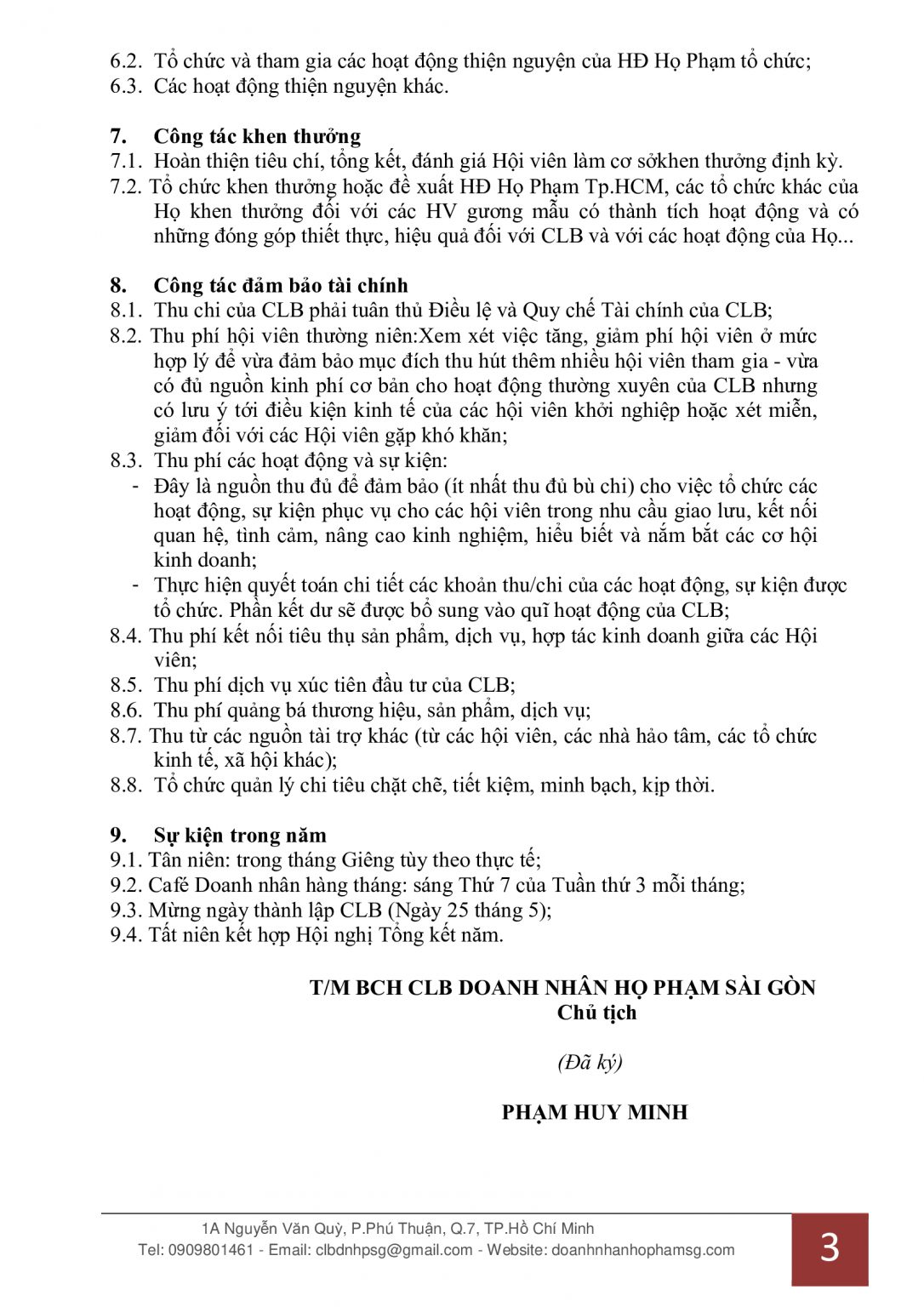 - Thường niên: Tổ chức Lễ kỷ niệm 20 năm thành lập HĐHP TPHCM; Cuộc họp BCH CLB Doanh Nhân Họ Phạm Sài Gòn cùng BCH Hội đồng Họ Phạm TPHCM...