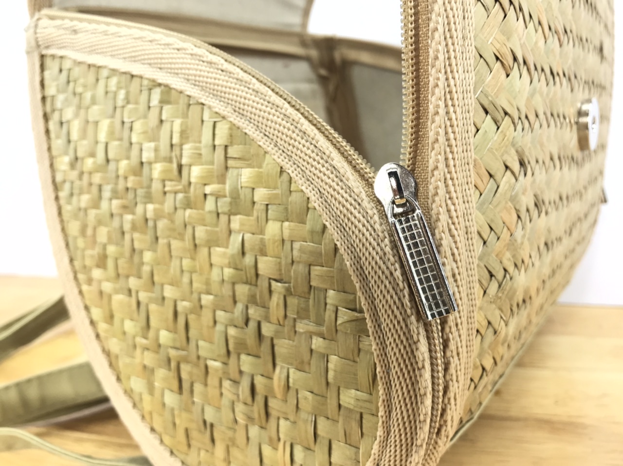 - Lớp bên ngoài được đan chắc chắn bằng cỏ bàng, những đường đan chi tiết tỉ mỉ, được làm thủ công bởi các nghệ nhân là người dân địa phương. Vì lớp ngoài là lớp cỏ khô nên nó rắn chắc, đàn hồi tốt, được thiết kế để làm bộ khung cho giỏ. Đường chỉ may ngay ngắn, ngăn nắp, đồng đều. Màu chỉ được lựa chọn, hài hoà với tổng thể màu của giỏ, không bị chõi màu. Cho nên, lớp vỏ ngoài của balo được ví như người phụ nữ Việt Nam rắn rỏi, bất khuất.