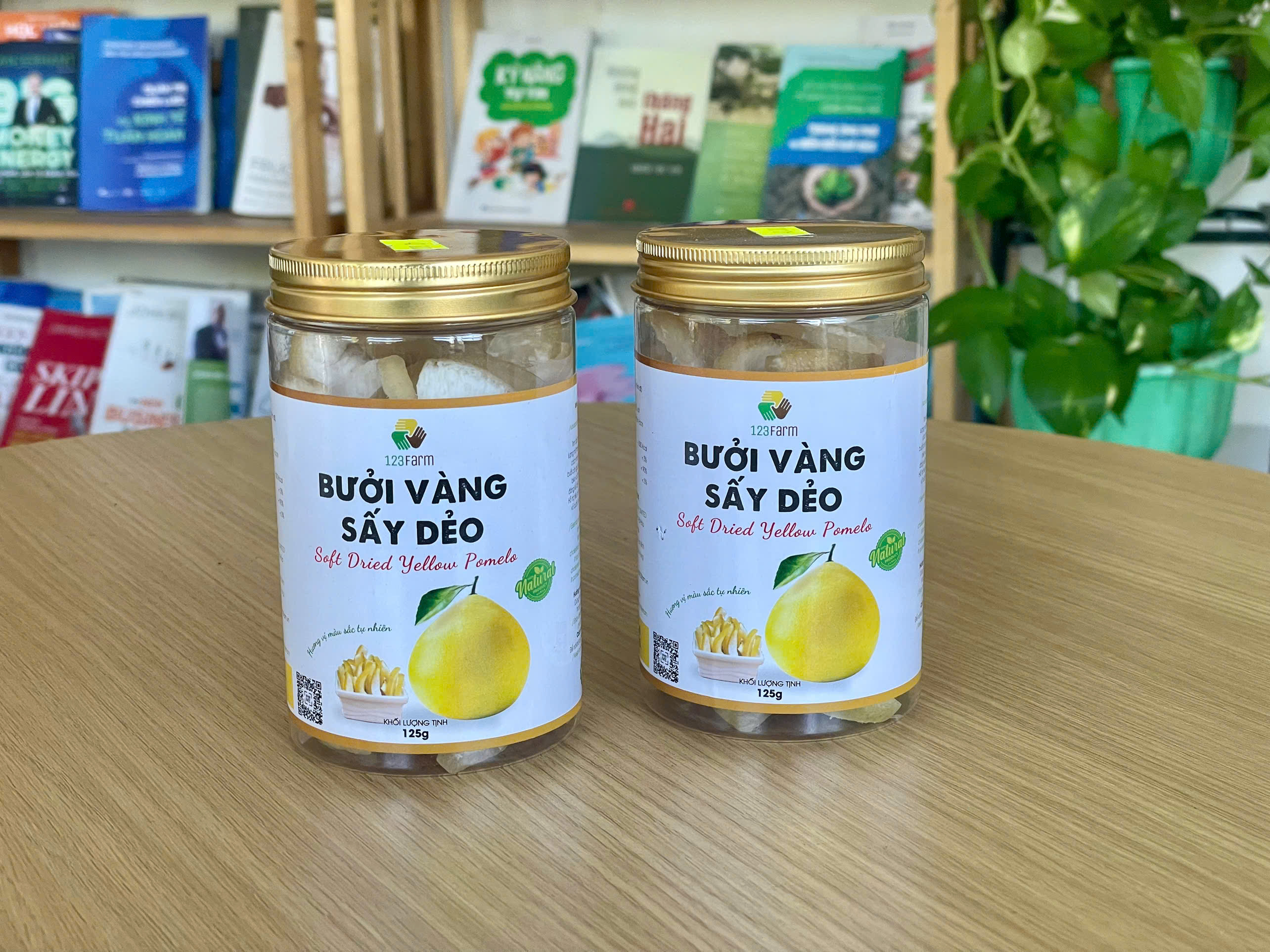 Trái bưởi chín được tuyển chọn từ những nông trại uy tín chất lượng, kết hợp với quy trình sản xuất theo công thức chế biến riêng biệt của 123 Farm, qua quá trình sấy dẻo, tạo ra sản phẩm mềm dẻo, có vị the của tinh dầu bưởi, kết hợp hài hòa với vị chua và vị ngọt thanh, thơm nhẹ hương Bưởi. Sản phẩm từ thiên nhiên, không phẩm màu hóa học, an toàn cho sức khỏe.