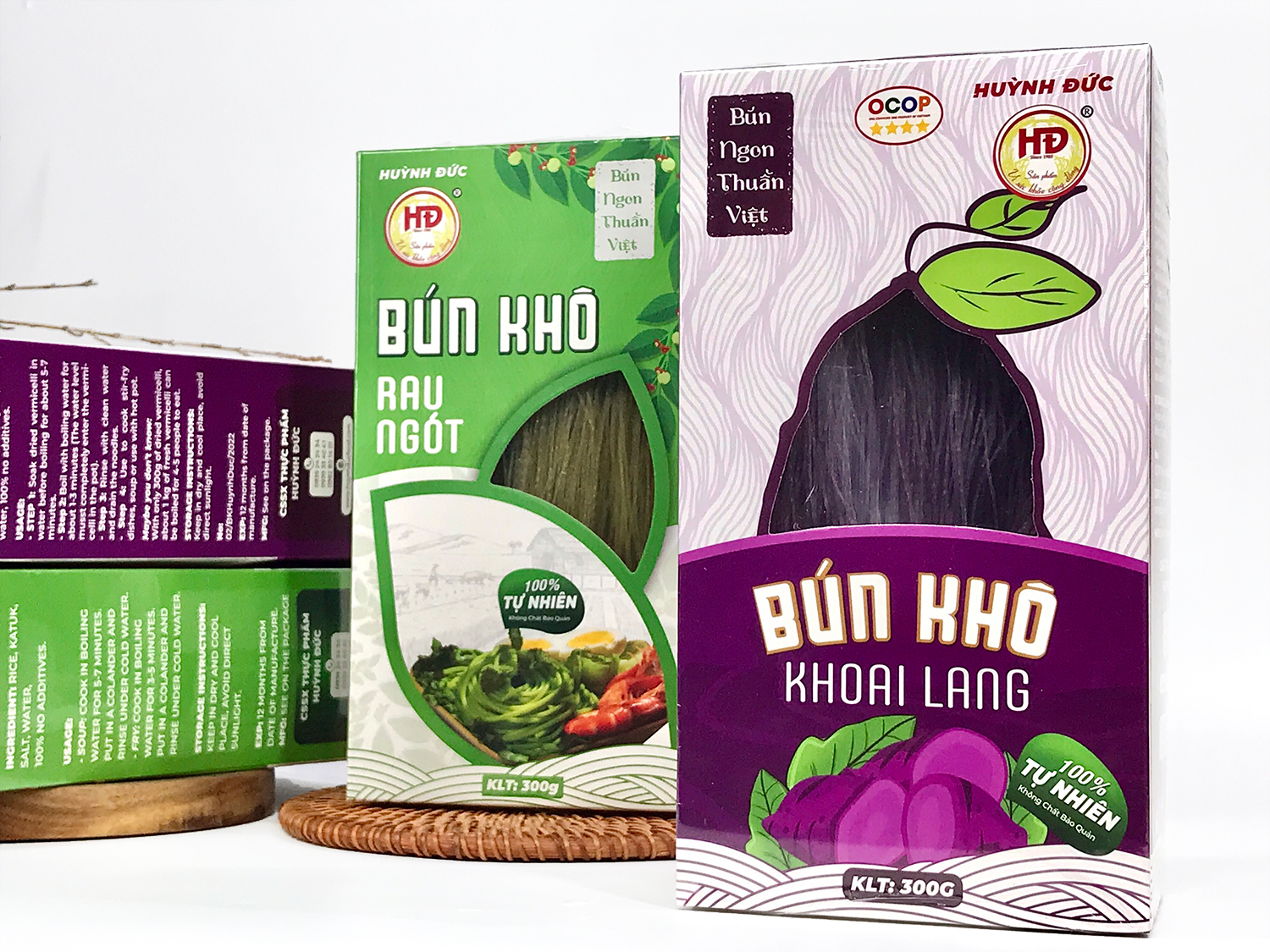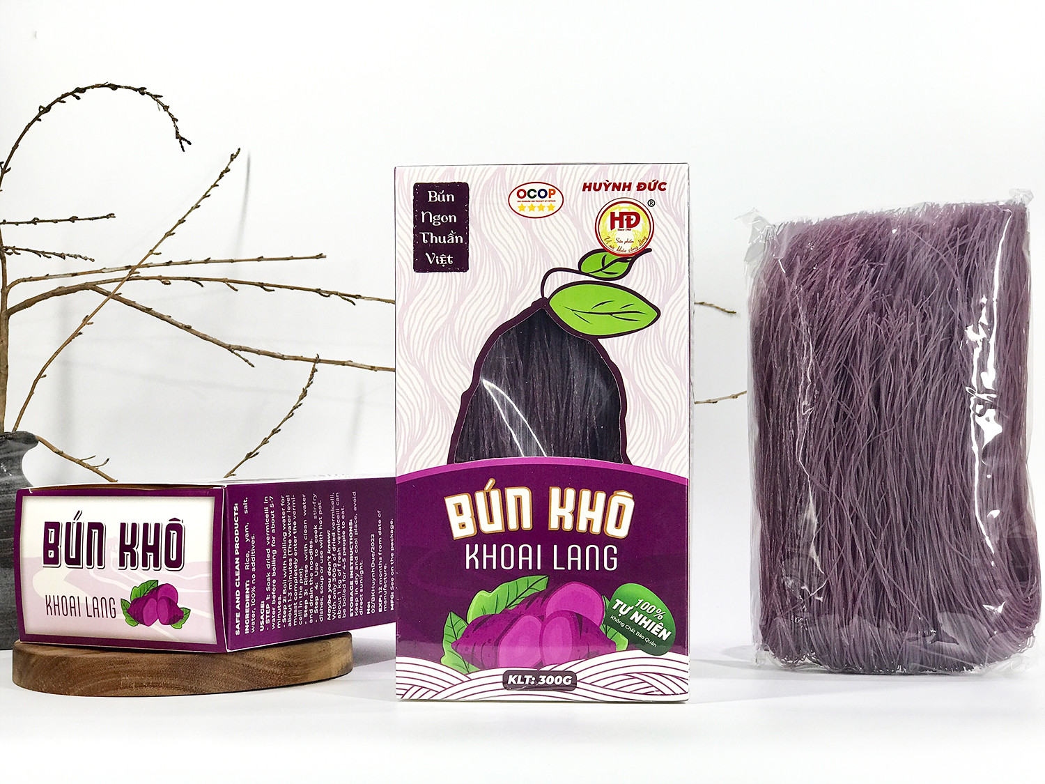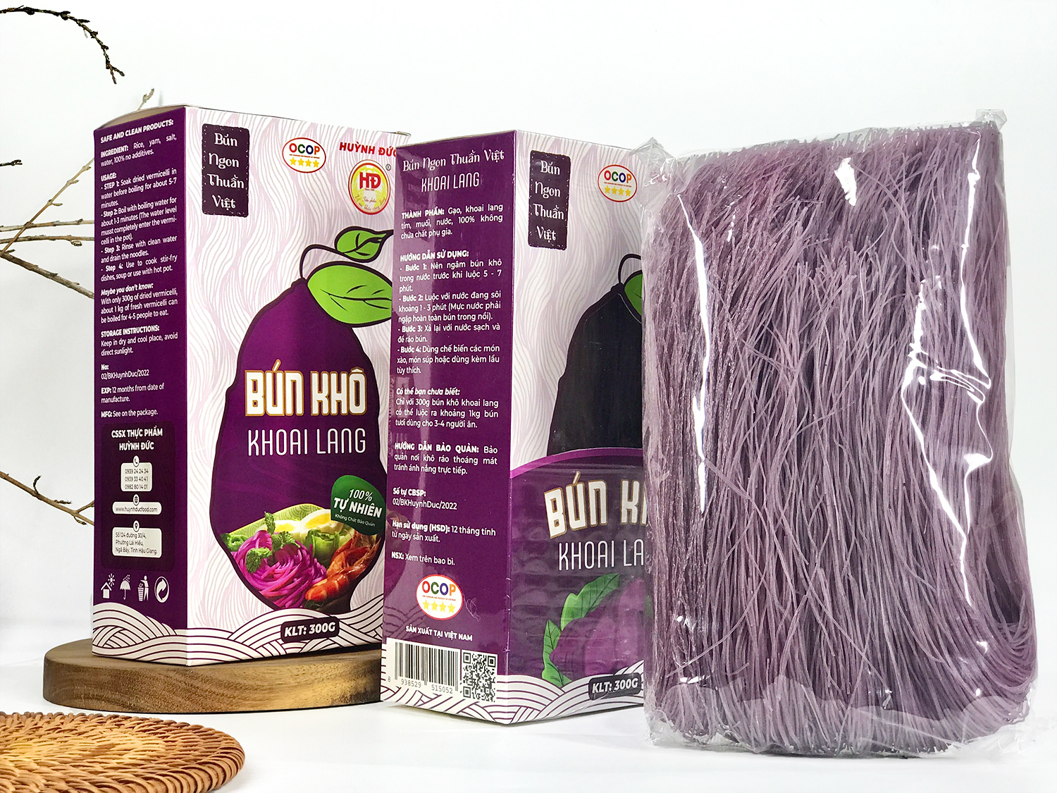 Bún khô Khoai Lang có nguyên liệu chính làm từ gạo, khoai lang tím, muối, nước, đặc biệt là 100% không chứa chất phụ gia. Sản phẩm đã đạt được chứng nhập OCOP là sản phẩm đạt an toàn vệ sinh thực phẩm.