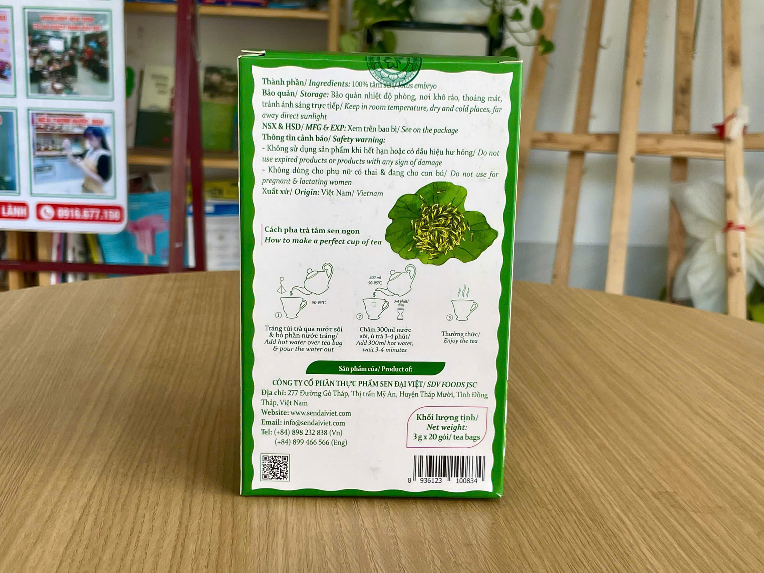 Trà Tâm Sen Đại Việt là trà thảo mộc cao cấp được chế biến từ tâm sen tươi, mang đến hương vị thanh nhẹ và nhiều lợi ích sức khỏe. Sản phẩm giúp thanh lọc cơ thể, giải độc và hỗ trợ tiêu hóa, đồng thời an thần, giảm căng thẳng, lo âu, cải thiện giấc ngủ, rất phù hợp cho những ai gặp vấn đề về mất ngủ hoặc stress.