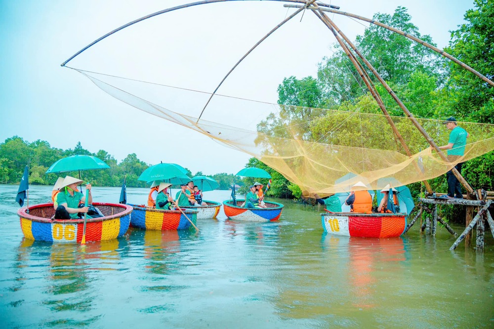 Tiếp nối hành trình, bạn sẽ được chèo thuyền thúng trên sông Cửa Cạn, len lỏi qua rừng ngập mặn, chiêm ngưỡng cảnh quan mộc mạc và lắng nghe câu chuyện văn hóa địa phương. Trải nghiệm trọn vẹn hơn với bữa trưa thực đơn ngon miệng bên dòng sông yên bình – một kết hợp hoàn hảo giữa thiên nhiên, ẩm thực và sự thư giãn.