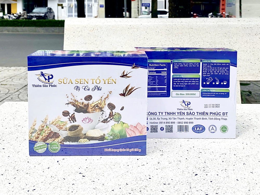 Sữa hạt tổ yến Thiên Gia Phúc là sản phẩm dinh dưỡng được sản xuất tại Đồng Tháp, vùng đất nổi tiếng với nguồn nguyên liệu thiên nhiên phong phú và an toàn. Sản phẩm được chế biến từ các nguyên liệu tự nhiên tạo nên thức uống bổ dưỡng, thơm ngon, dễ sử dụ