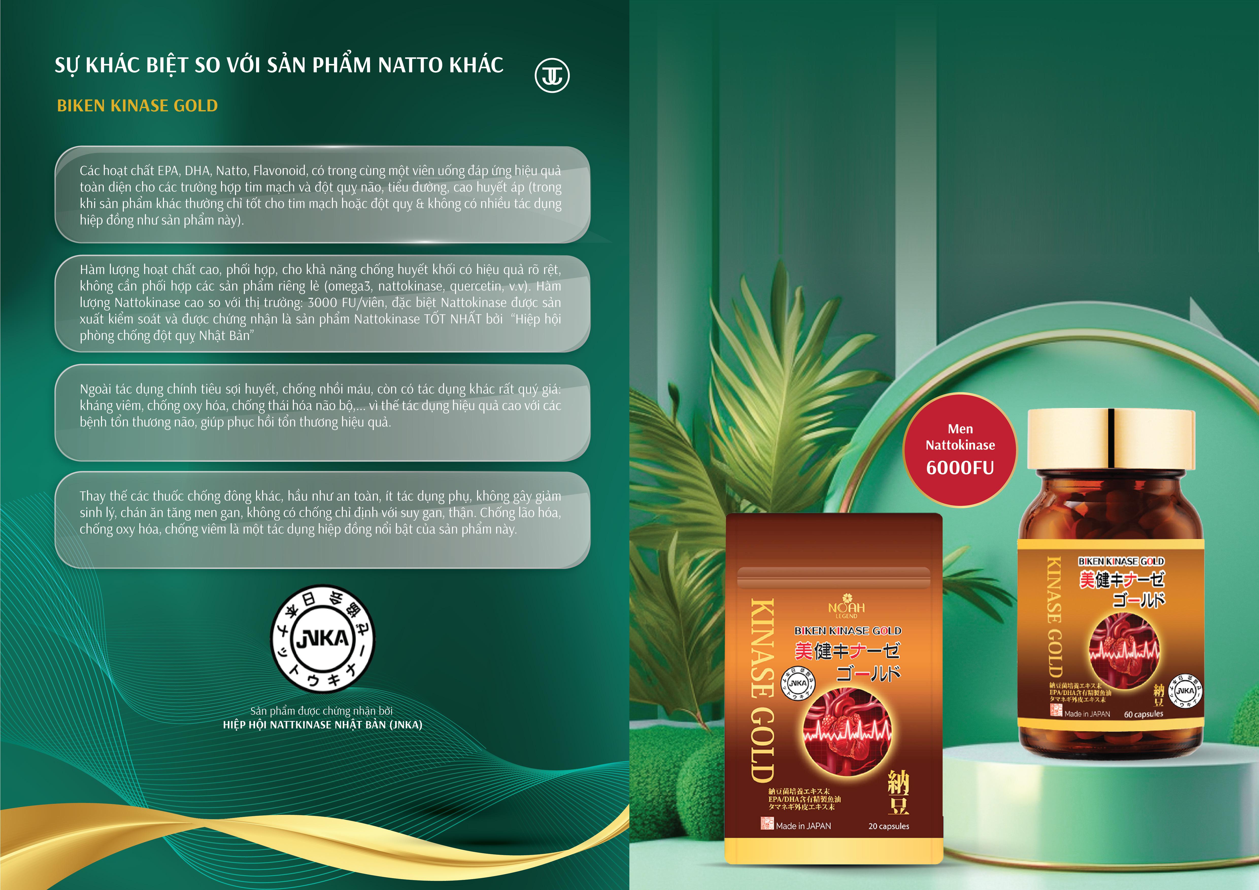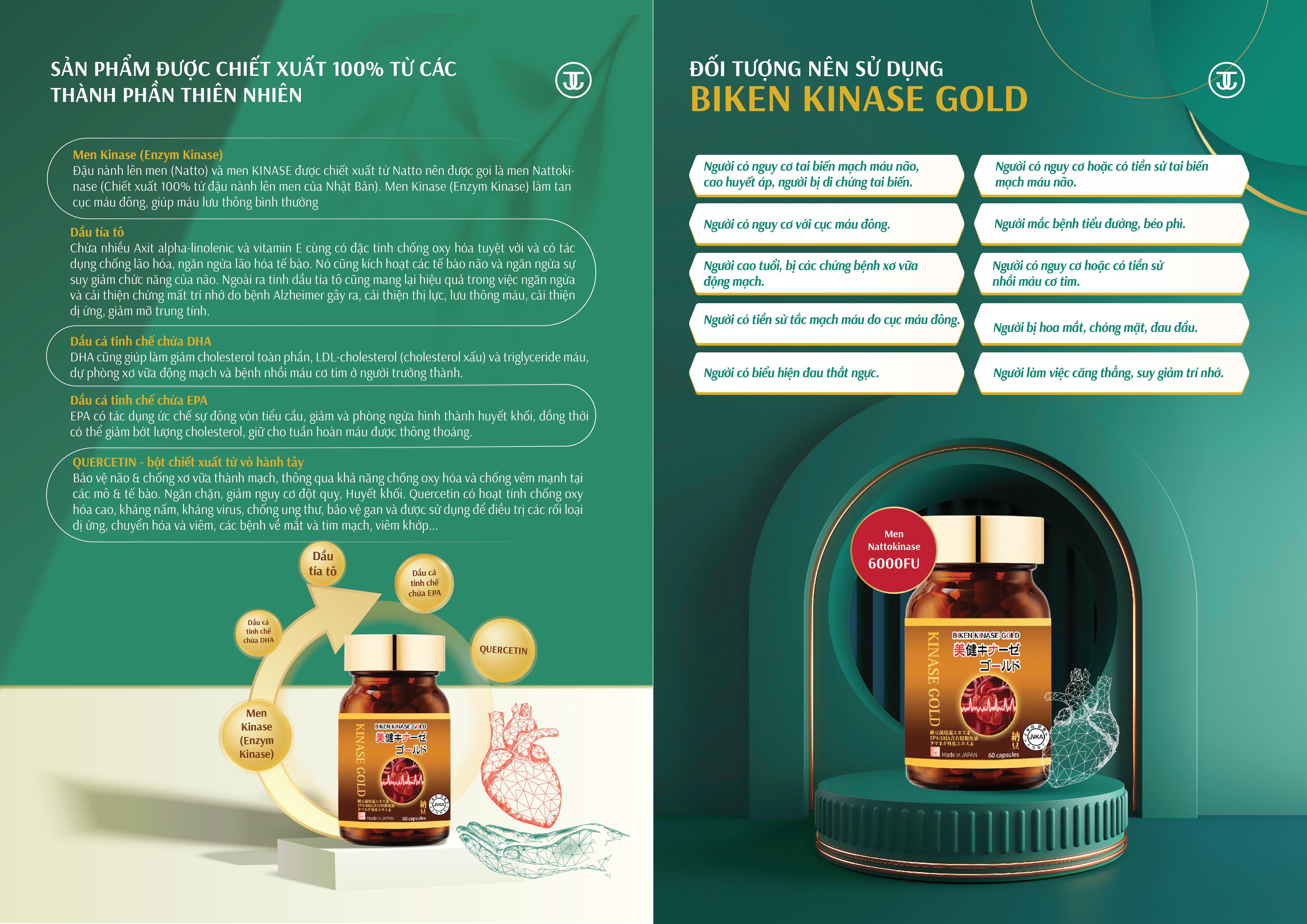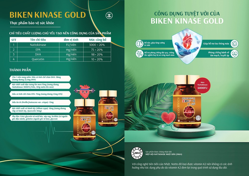 Viên uống Biken Kinase Gold là thực phẩm bảo vệ sức khỏe được sản xuất trên dây chuyền hiện đại tại Nhật Bản, có công dụng phòng chống đột quỵ, phòng chống bệnh tim mạch, tăng cường trí nhớ,…