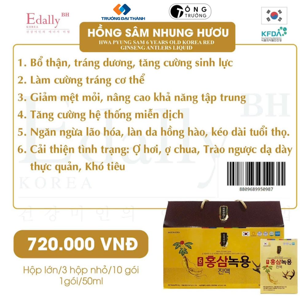 Nước Hồng Sâm Nhung Hươu Edally 6 Năm Tuổi là một sản phẩm chăm sóc sức khỏe cao cấp, nhập khẩu chính hãng từ Hàn Quốc. Sản phẩm này được tinh chế từ nhân sâm 6 năm tuổi, kết hợp với nhung hươu cao cấp từ New Zealand, cùng với các thảo dược quý hiếm khác. Sự kết hợp này tạo nên một loại nước bổ dưỡng với nhiều lợi ích vượt trội cho sức khỏe và quá trình phục hồi cơ thể.