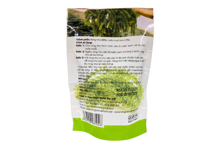 - Thành phần: Rong nho (88%), nước muối tinh (12%).