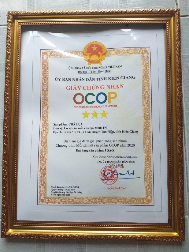 Đến năm 2020, Cơ sở đã thực hiện đề án mỗi xã một sản phẩm OCOP giai đoạn 2018-2020 theo tinh thần của Quyết định số 490/QĐ-TTg ngày 07/5/2018 của Thủ tướng Chính phủ, nhờ vào sự hỗ trợ và quan tâm sâu sắc từ Thường trực Đảng ủy – UBND xã Tân An; Phòng Nông Nghiệp – Phát Triển Nông Thôn Tân Hiệp; và Chi cục Phát Triển Nông Thôn tỉnh Kiên Giang, và sự nỗ lực của Cơ sở, sản phẩm Chả lụa Minh Trí đã đạt hạng Sản phẩm OCOP 3 Sao cấp tỉnh.