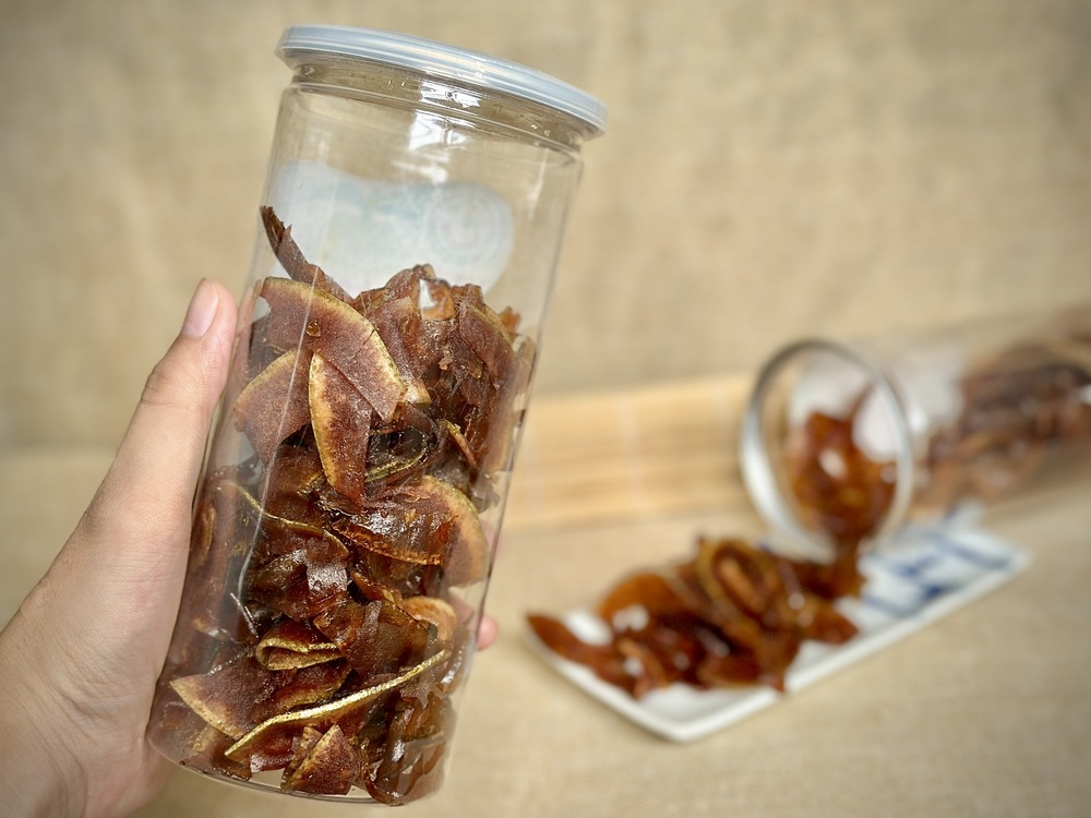 Vỏ bưởi sấy dẻo mật ong, một món ăn vặt ngon miệng, dễ làm và có nhiều công dụng tốt cho sức khỏe. Vỏ bưởi sấy dẻo mật ong có hương vị ngọt thanh, thơm mật ong và cay the của bưởi, rất hấp dẫn và cuốn hút. Vỏ bưởi sấy dẻo mật ong còn chứa nhiều vitamin C, chất xơ, chất chống oxy hóa, tinh dầu và các chất khoáng chất, giúp giảm cân, hỗ trợ điều trị ho, làm đẹp da, khỏe dáng, giảm mỡ trong gan, điều trị khó tiêu, đầy bụng…