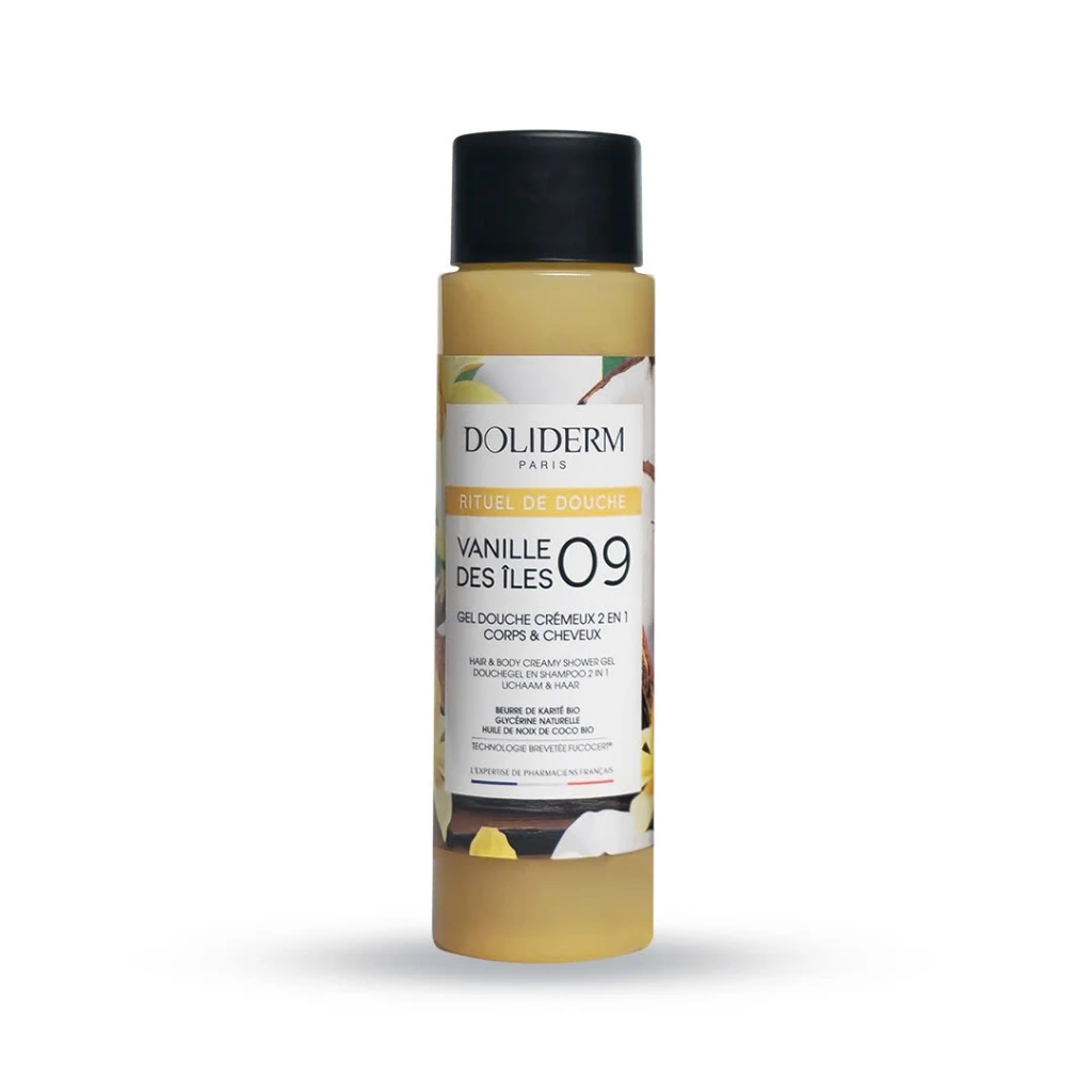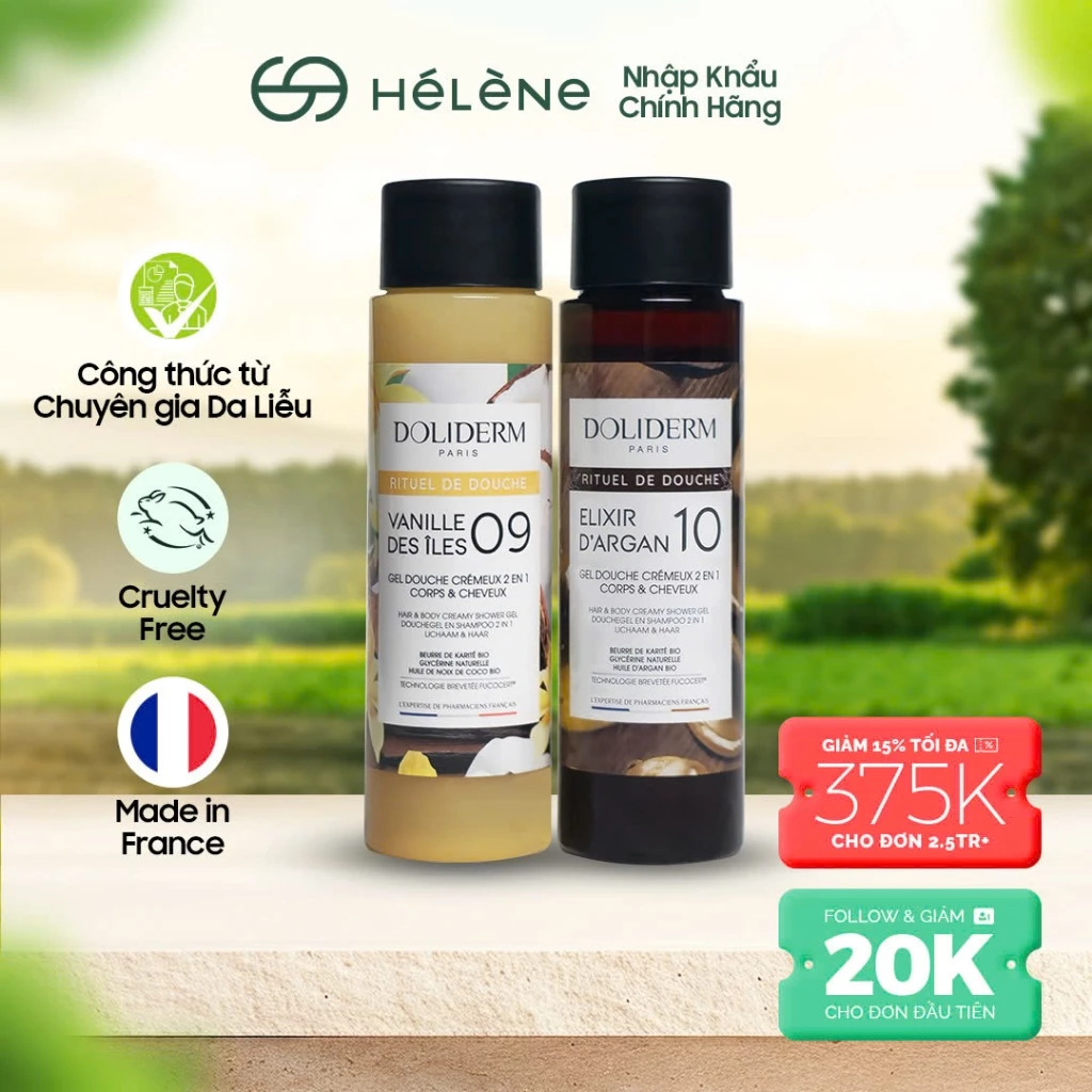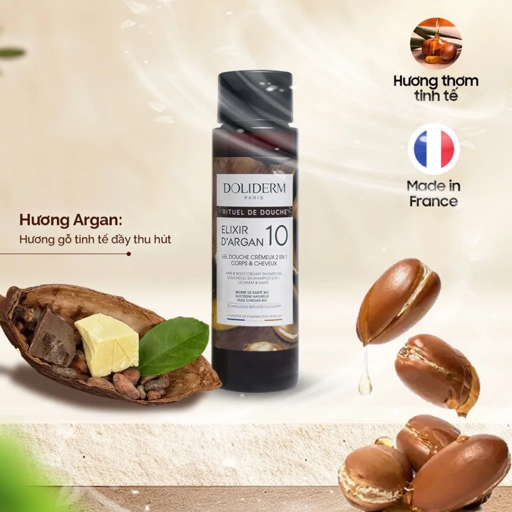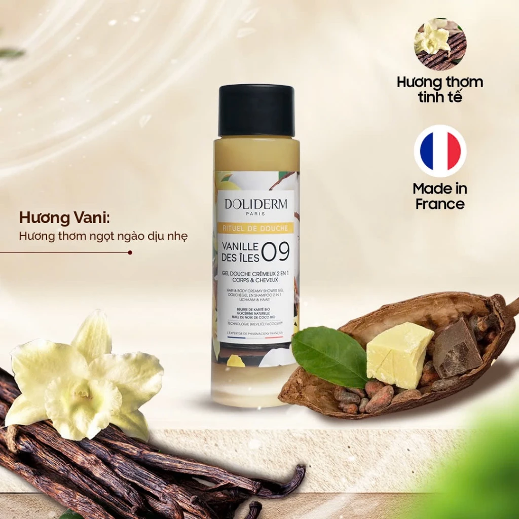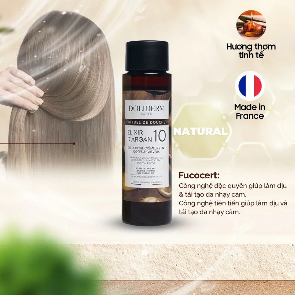 Gel tắm gội 2in1 Doliderm, chiết xuất chính từ bơ hạt mỡ hữu cơ, cung cấp độ ẩm tối ưu giúp cải thiện sự dễ chịu cho làn da nhạy cảm hoặc khô. Đặc biệt két hợp với những thành phần thiên nhiên hữu cơ như dầu Argan, dầu Dừa, nổi tiếng với đặc tính nuôi dưỡng và phục hồi, nhẹ nhàng cấp ẩm cho làn da của bạn. Công nghệ Fucocert tập trung những dẫn xuất lành tính giàu dưỡng chất từ thiên nhiên, sản phẩm giúp dưỡng ẩm sâu, bảo vệ làn da & phục hồi tóc chắc khỏe. Công nghệ Fucocert làm dịu da nhạy cảm, giảm khô căng, mang lại làn da mềm mại & mái tóc óng ả từ gốc đến ngọn, kèm theo hương thơm tinh tế, thư giãn.