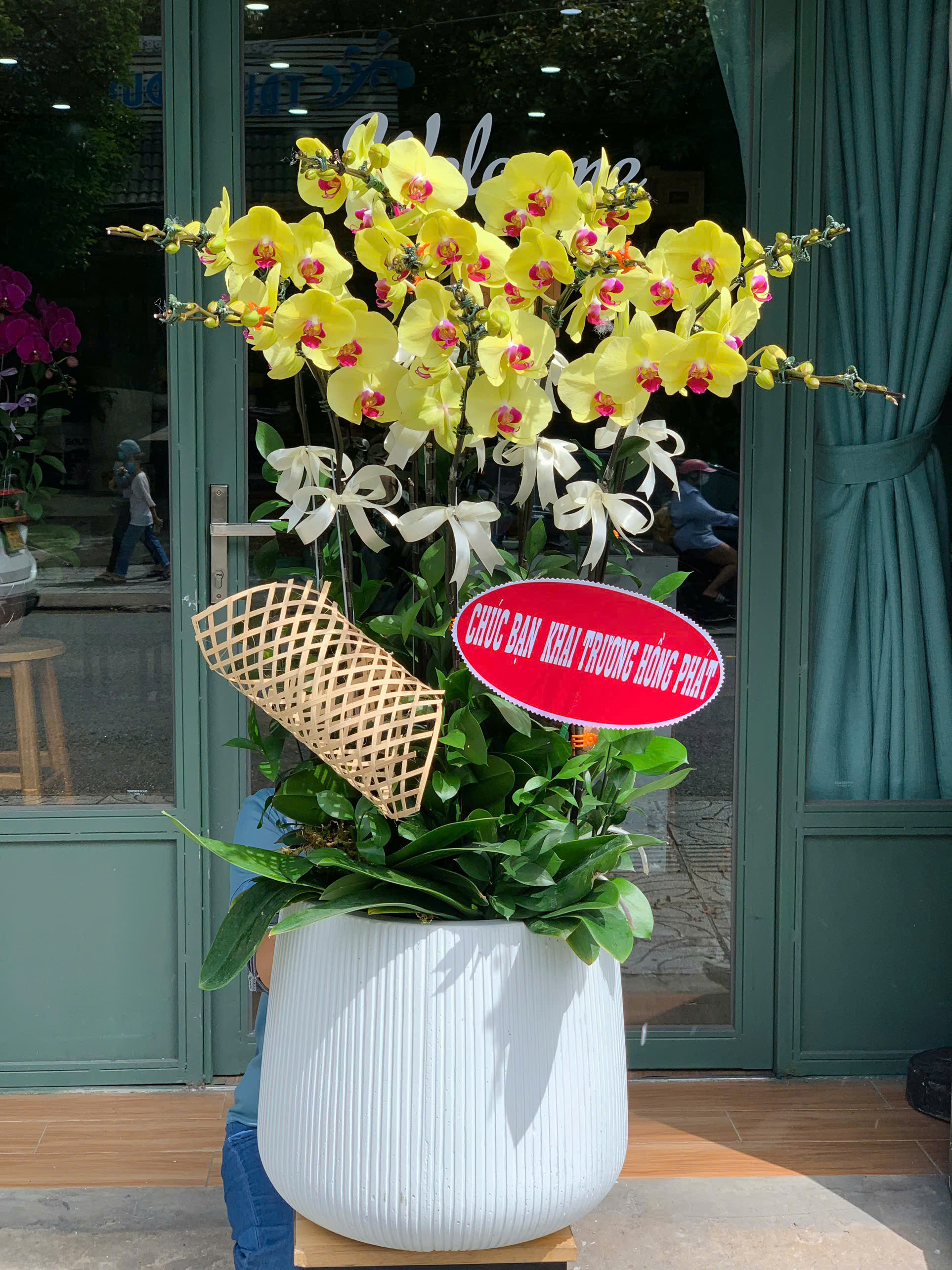 Chậu lan gồm 9 cành hoa lan hạng A bông to, chậu sứ và trang trí đẹp hiện đại.