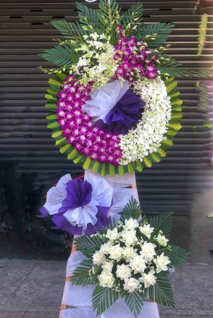 Vòng hoa chia buồn lan trắng và tím trang trọng