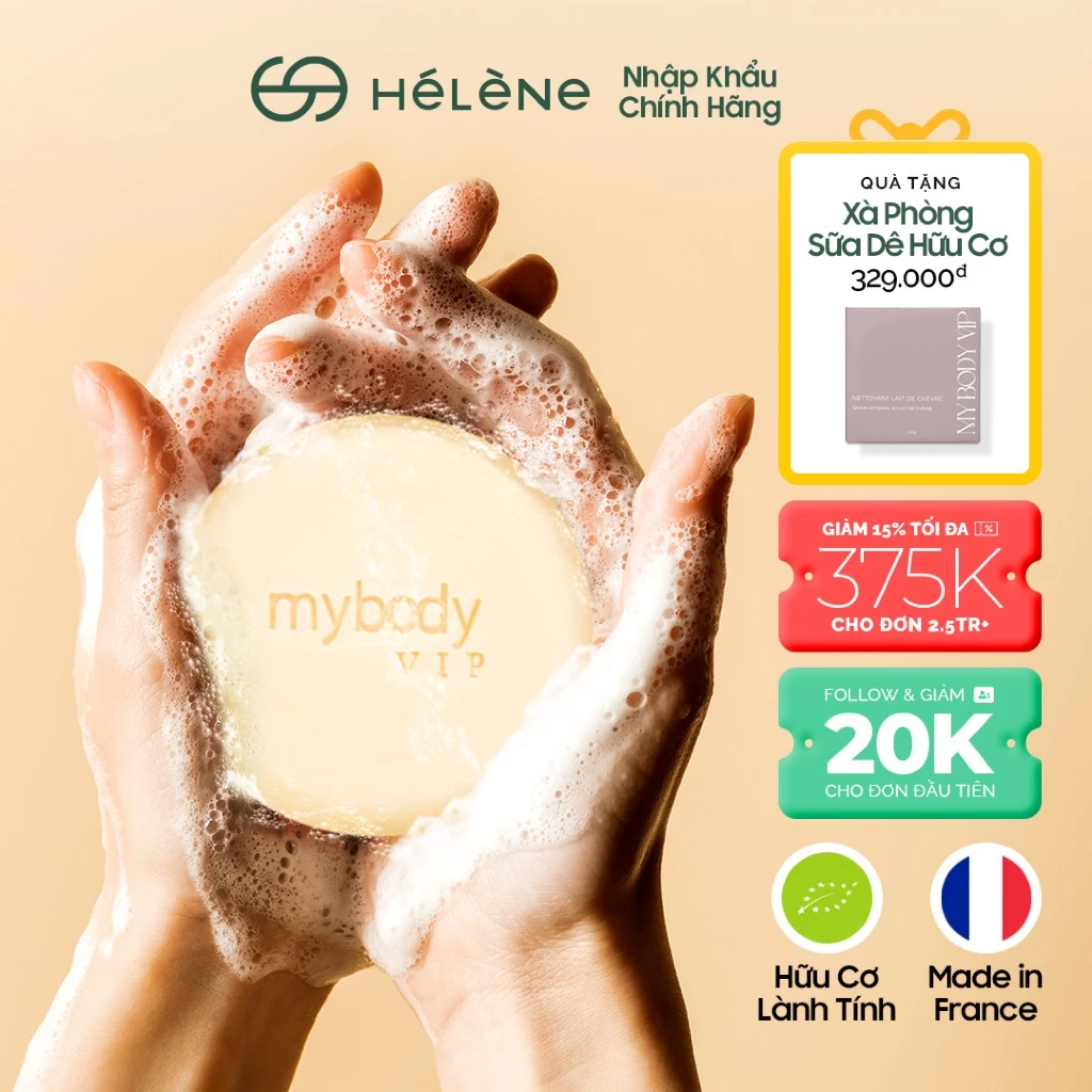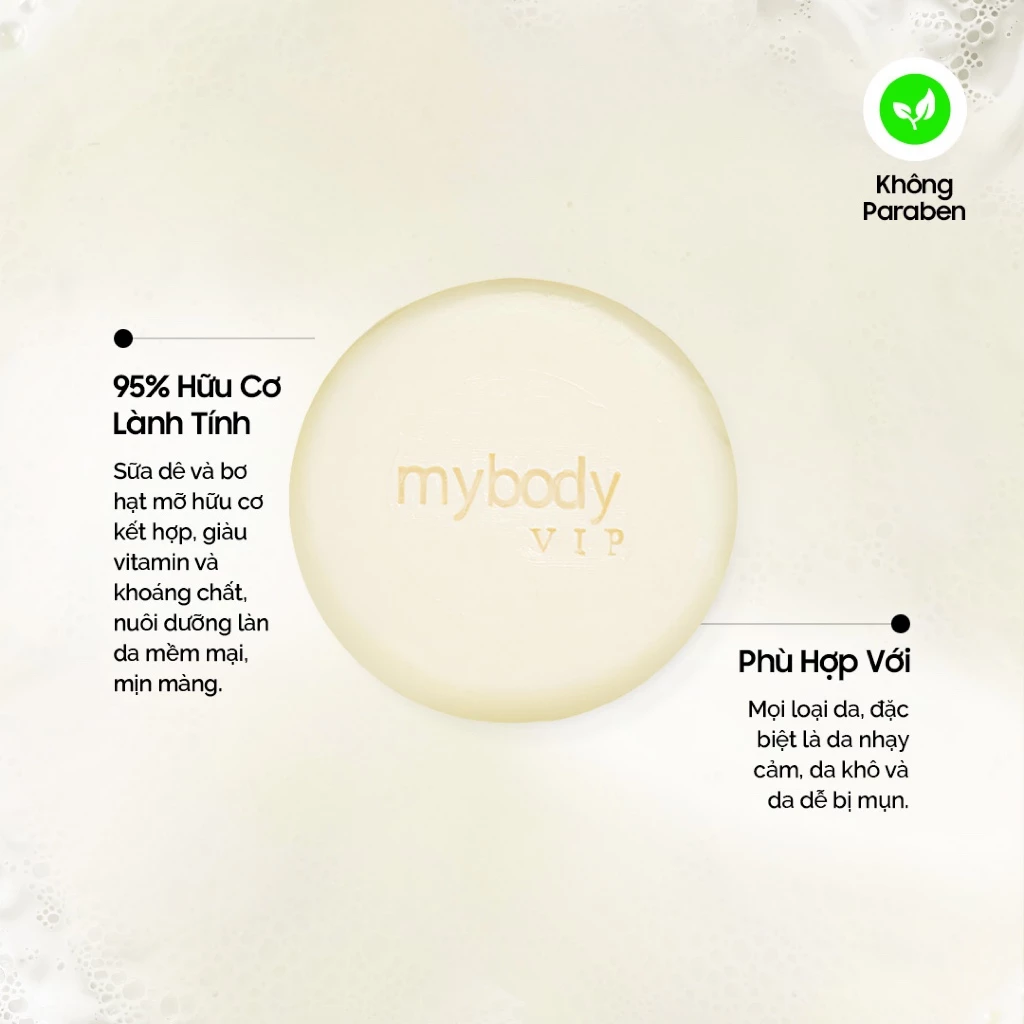Xà Phòng Rửa Mặt Sữa Dê Hữu Cơ My Body VIP với 95% thành phần tự nhiên, kết hợp sữa dê hữu cơ và bơ hạt mỡ, nhẹ nhàng làm sạch da, đồng thời dưỡng ẩm sâu và làm dịu da nhạy cảm. Sản phẩm thích hợp cho mọi loại da, kể cả da dễ bị mụn trứng cá, da nhờn và da không dung nạp.