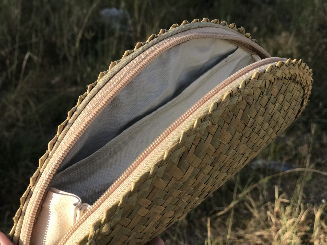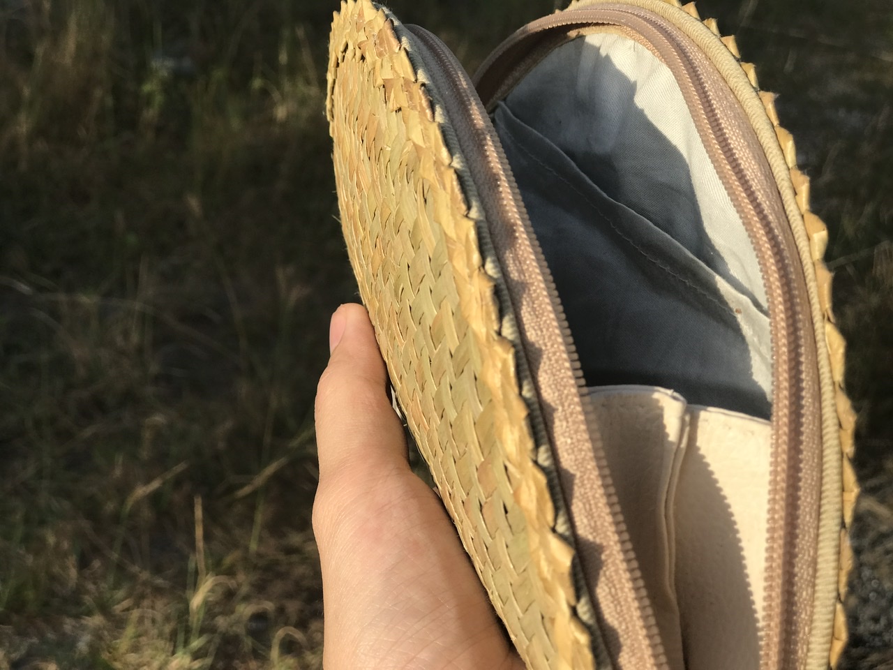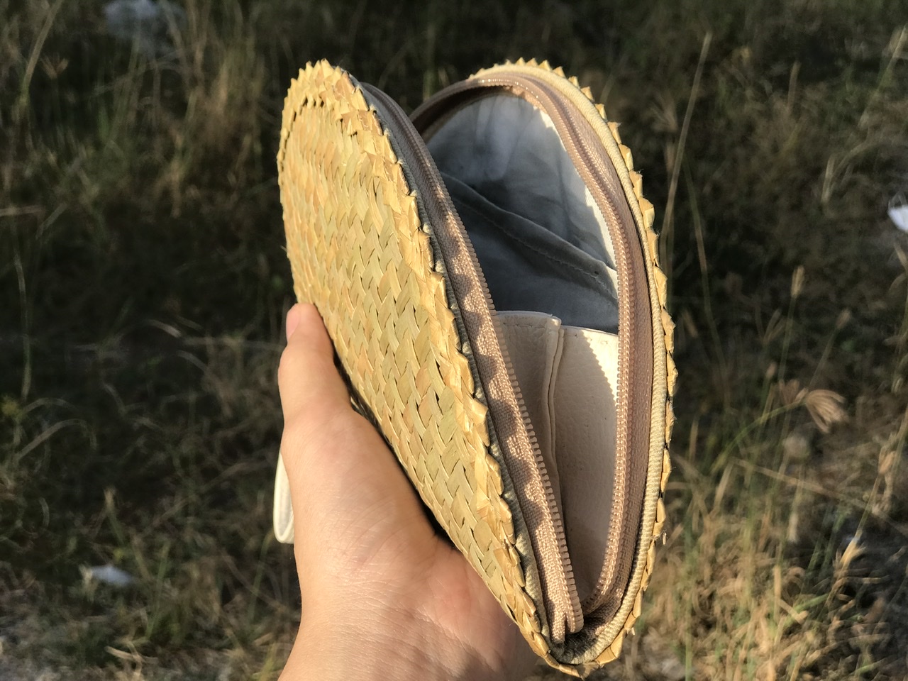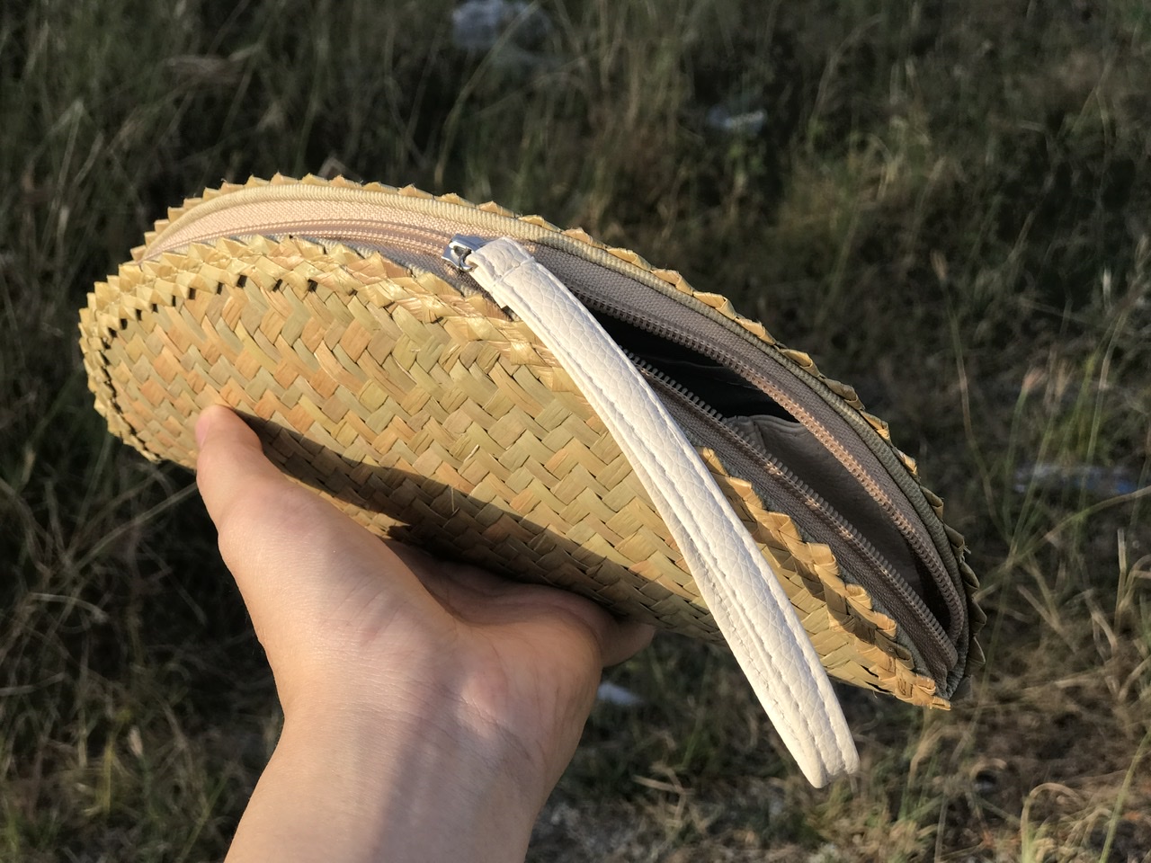 - Lớp ngoài được đan bằng cỏ bàng, với các đường đan tinh tế, tạo nên bộ khung của ví. Lớp viền bằng vải bên ngoài có thể tạo nên cảm giác mềm mại để người dùng để cầm nắm