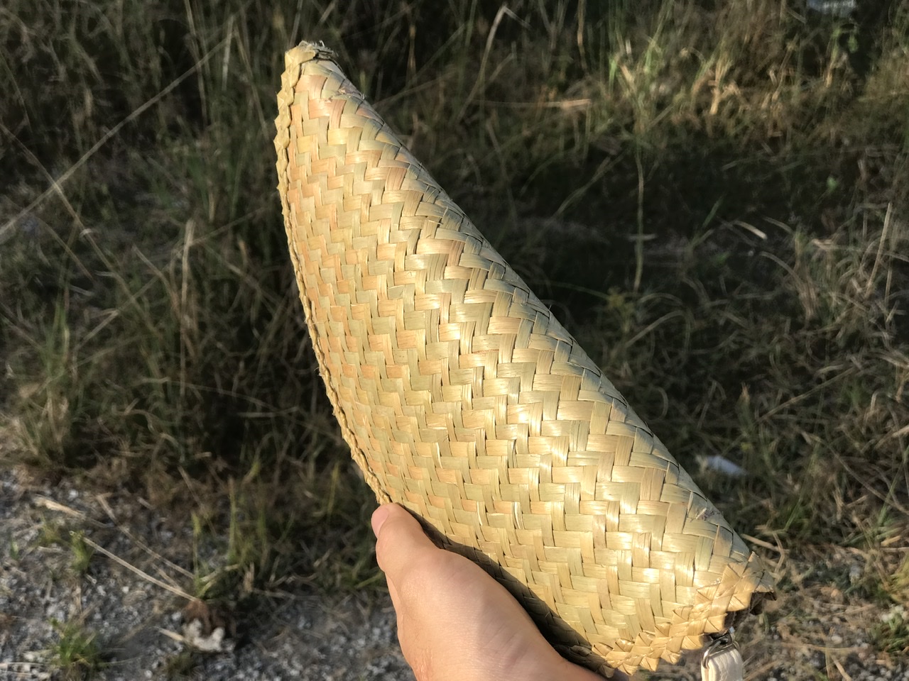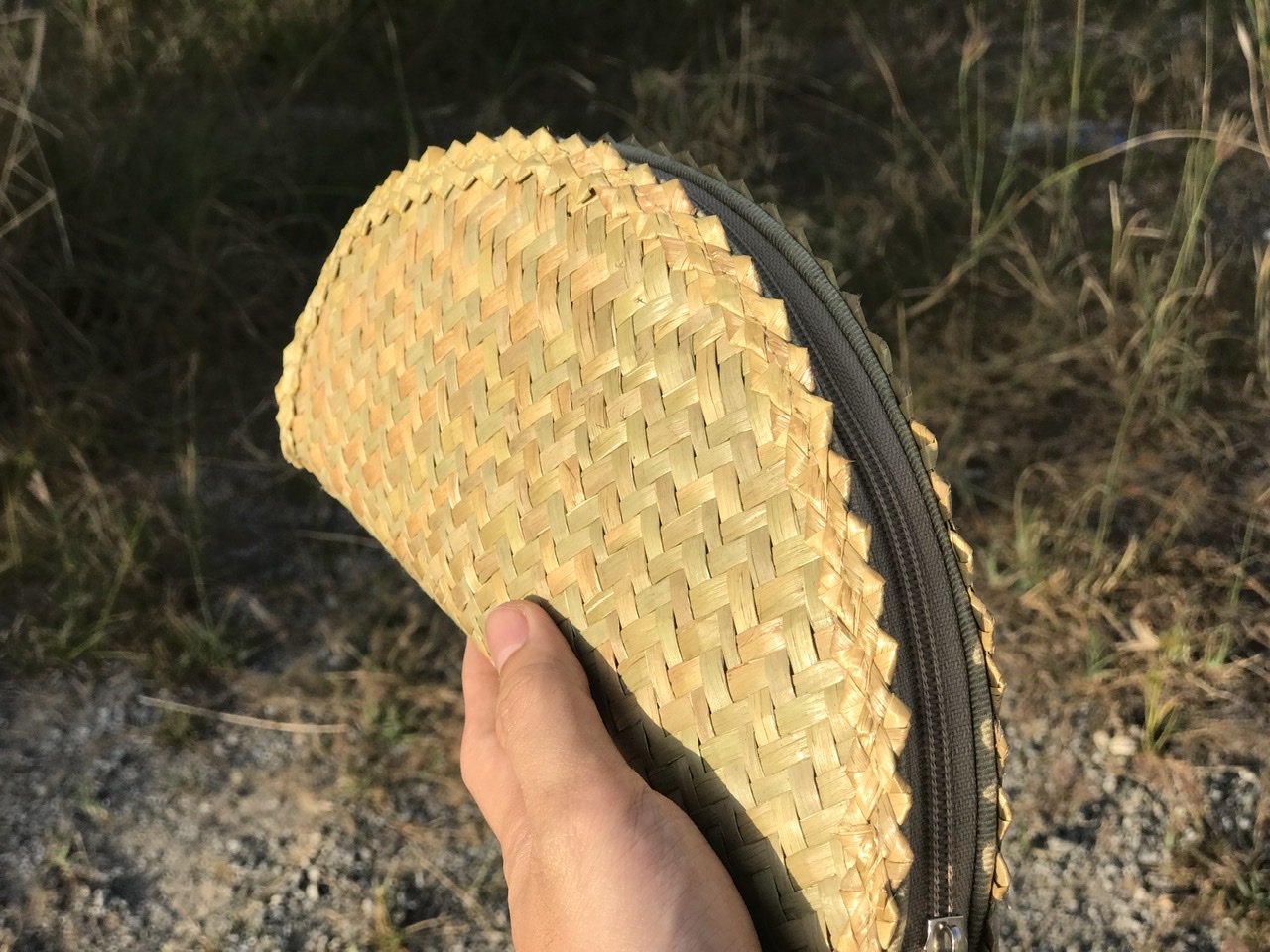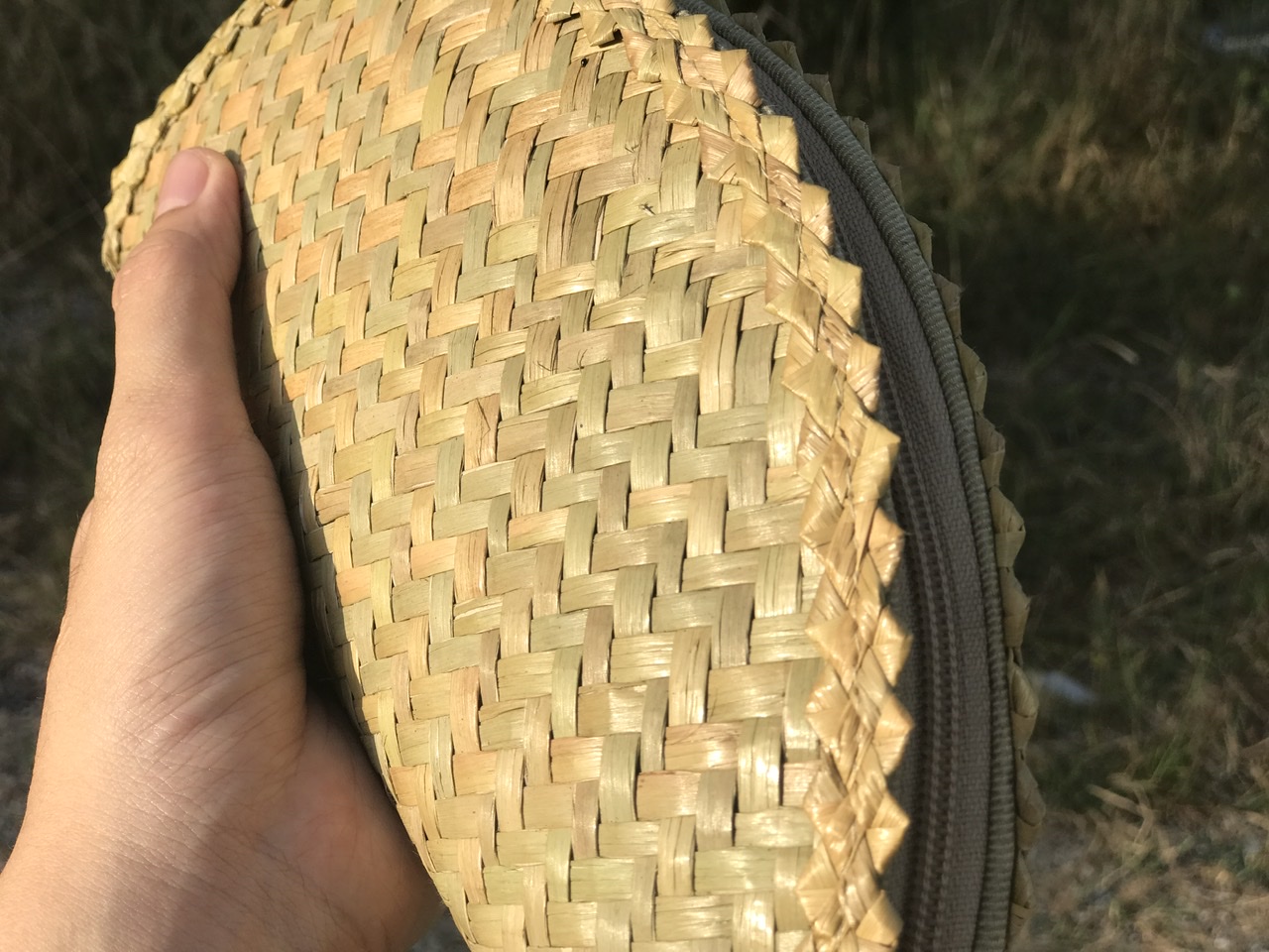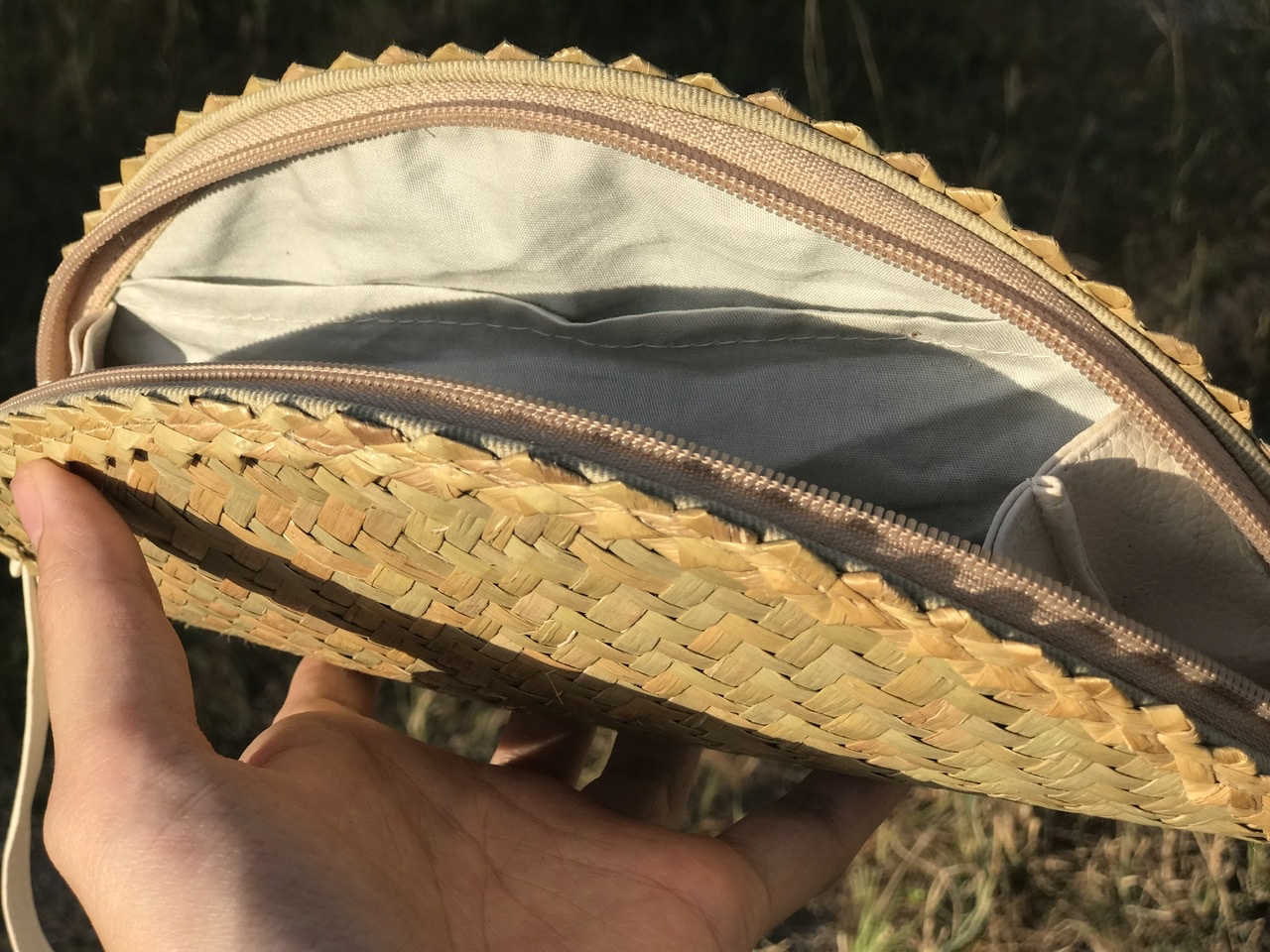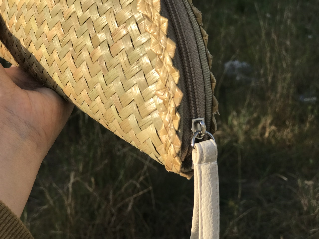 - Lớp ngoài được đan bằng cỏ bàng, với các đường đan tinh tế, tạo nên bộ khung của ví. Lớp viền bằng vải bên ngoài có thể tạo nên cảm giác mềm mại để người dùng để cầm nắm