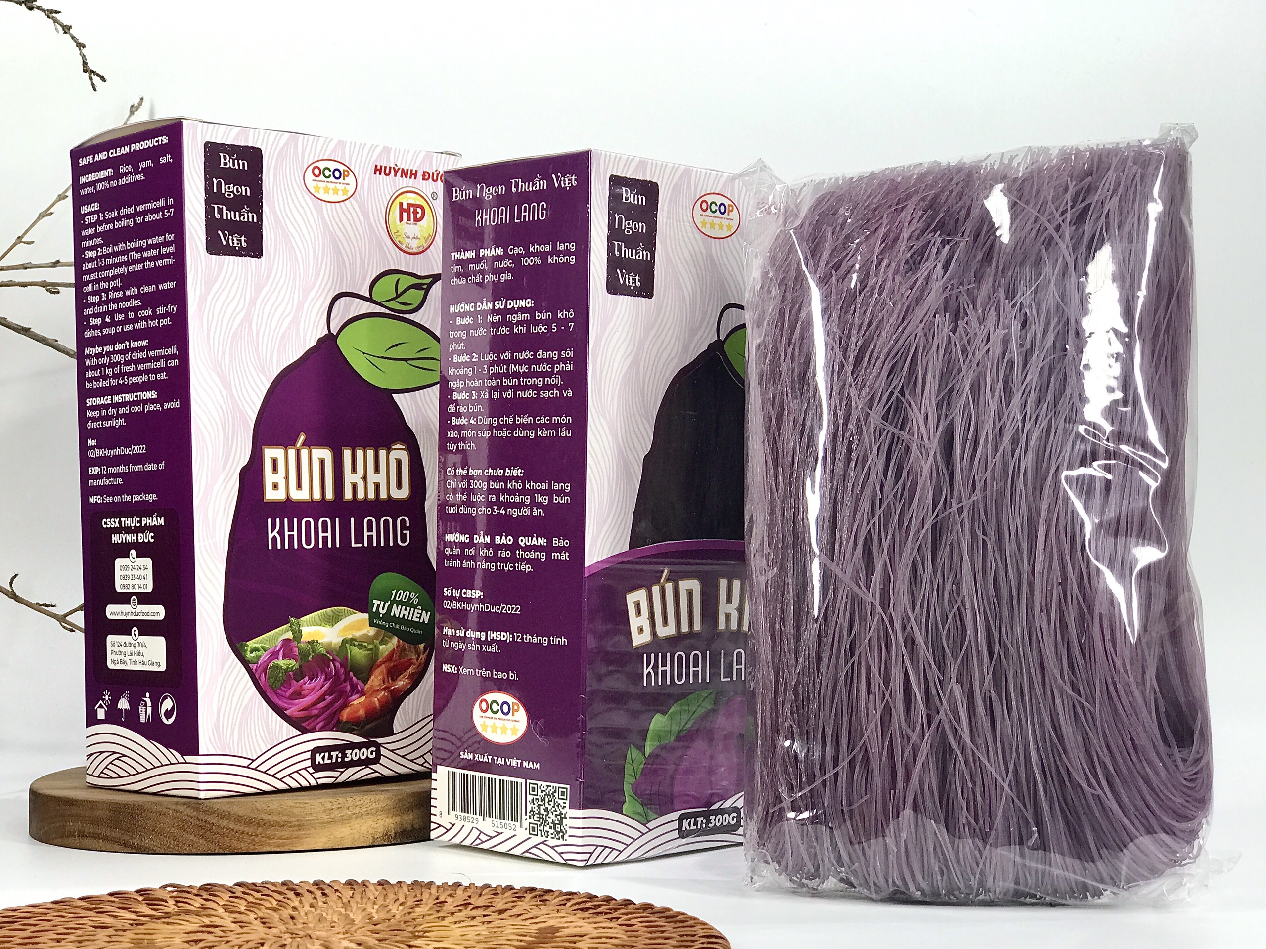 Bún khô Khoai Lang có nguyên liệu chính làm từ gạo, khoai lang tím, muối, nước, đặc biệt là 100% không chứa chất phụ gia. Sản phẩm đã đạt được chứng nhập OCOP là sản phẩm đạt an toàn vệ sinh thực phẩm.