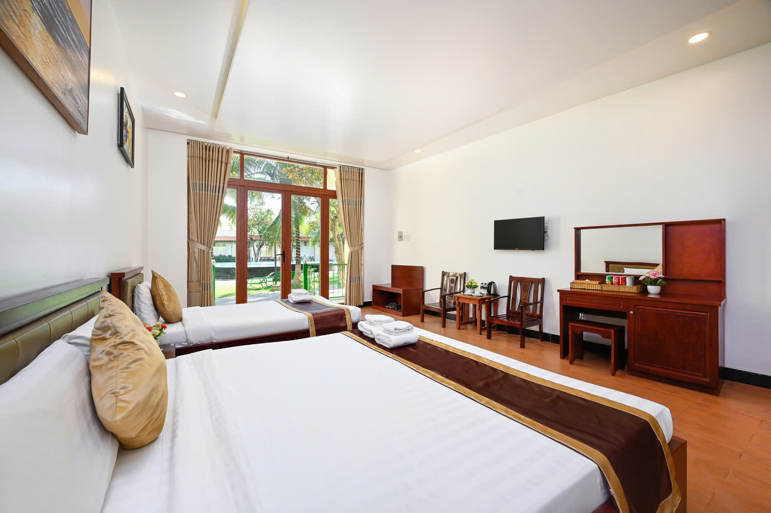 Tất cả trong một, chúng tôi có khách sạn, resort, trung tâm hội nghị, coffee shop, … là ưu thế để quý khách được phục vụ trọn vẹn nhất có thể tất cả các nhu cầu cá nhân hay đội nhóm. Khu vực bungalow là khu nghỉ dưỡng độc đáo được trang bị đầy đủ tiện nghi với khung cảnh tuyệt đẹp của những rặng dừa, thảm cỏ & bể bơi rộng rãi thoáng đãng.