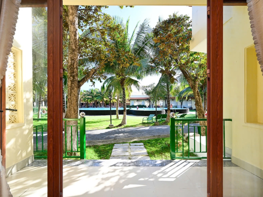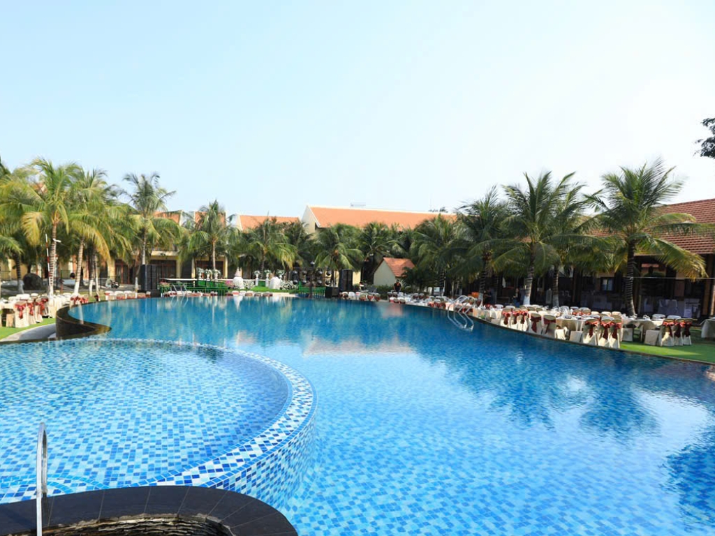 Hồ bơi tuyệt đẹp xung quanh là hàng dừa xanh và các loại cây trái xanh tươi, là nơi lý tưởng giúp Quý khách thư giãn, an yên.