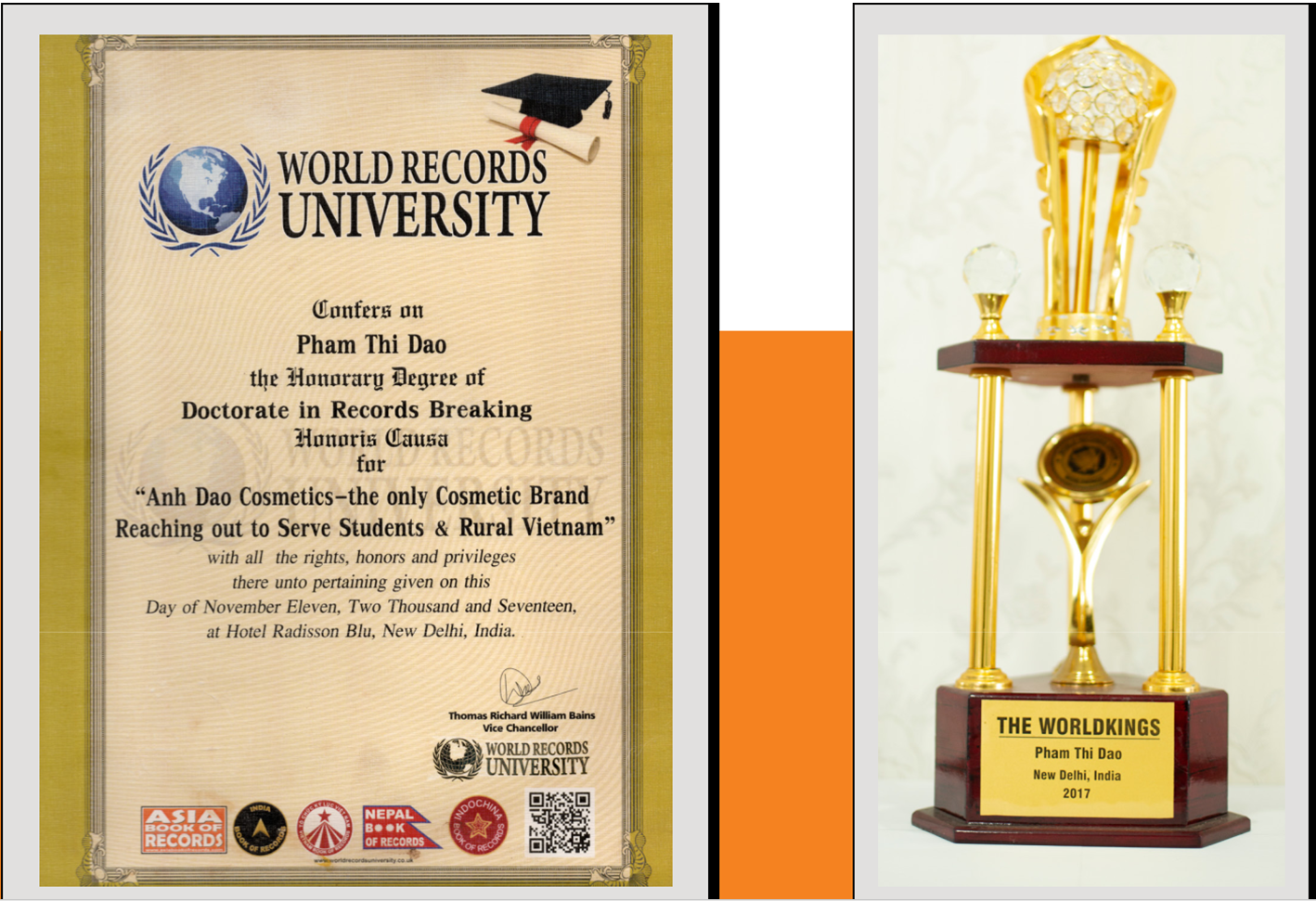 Với gần 30 năm kinh nghiệm trong ngành sản xuất và kinh doanh mỹ phẩm, thẩm mỹ làm đẹp, bắt đầu từ hai bàn tay trắng, vất vả ngược xuôi ra Bắc vào Nam để học hỏi kiến thức, trau dồi kinh nghiệm. Bà Phạm Thị Đào đã gây dựng CÔNG TY TNHH CÔNG TY TRÁCH NHIỆM HỮU HẠN SẢN XUẤT MỸ PHẨM ANH ĐÀO ngày một phá́t triển, được khá́ch hàng tin dùng ủng hộ về độ uy tín, chất lượng và chuyên nghiệp. Bằng tài năng và bản lĩnh của mình, Bà đã được ghi nhận với hàng chục thành tích, giải thưởng trong và ngoài nước. Đá́ng kể nhất là Chứng Nhận Tiến Sĩ Danh Dự Sản Phẩm Mỹ Phẩm Đạt Kỷ Lục Gia Quốc Tế tại Ấn Độ.
