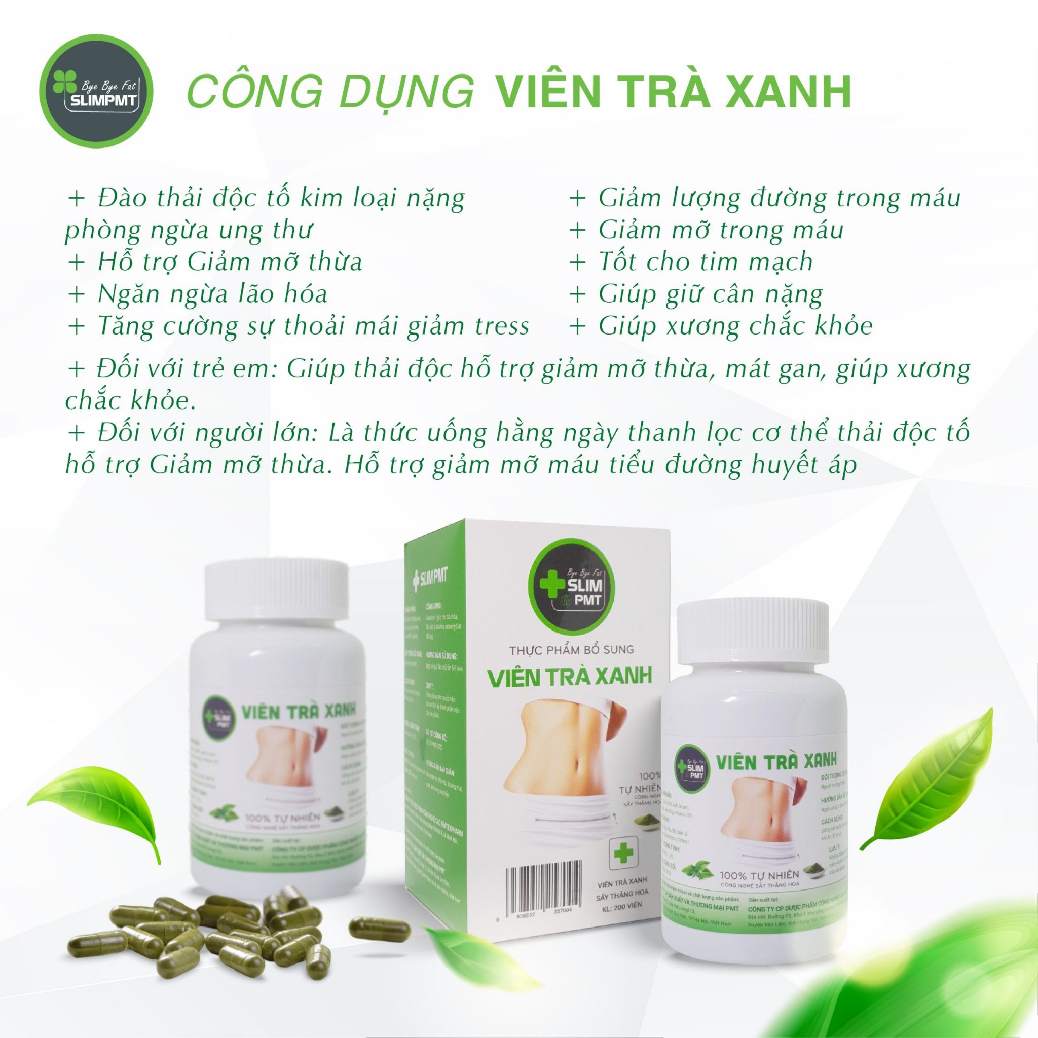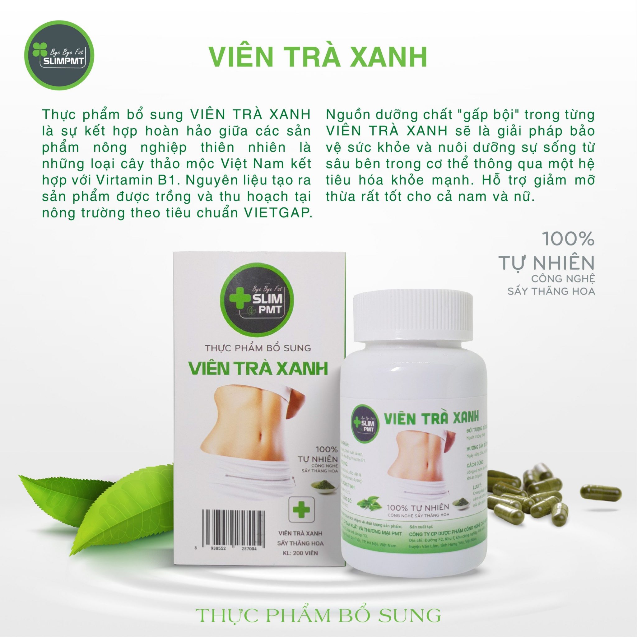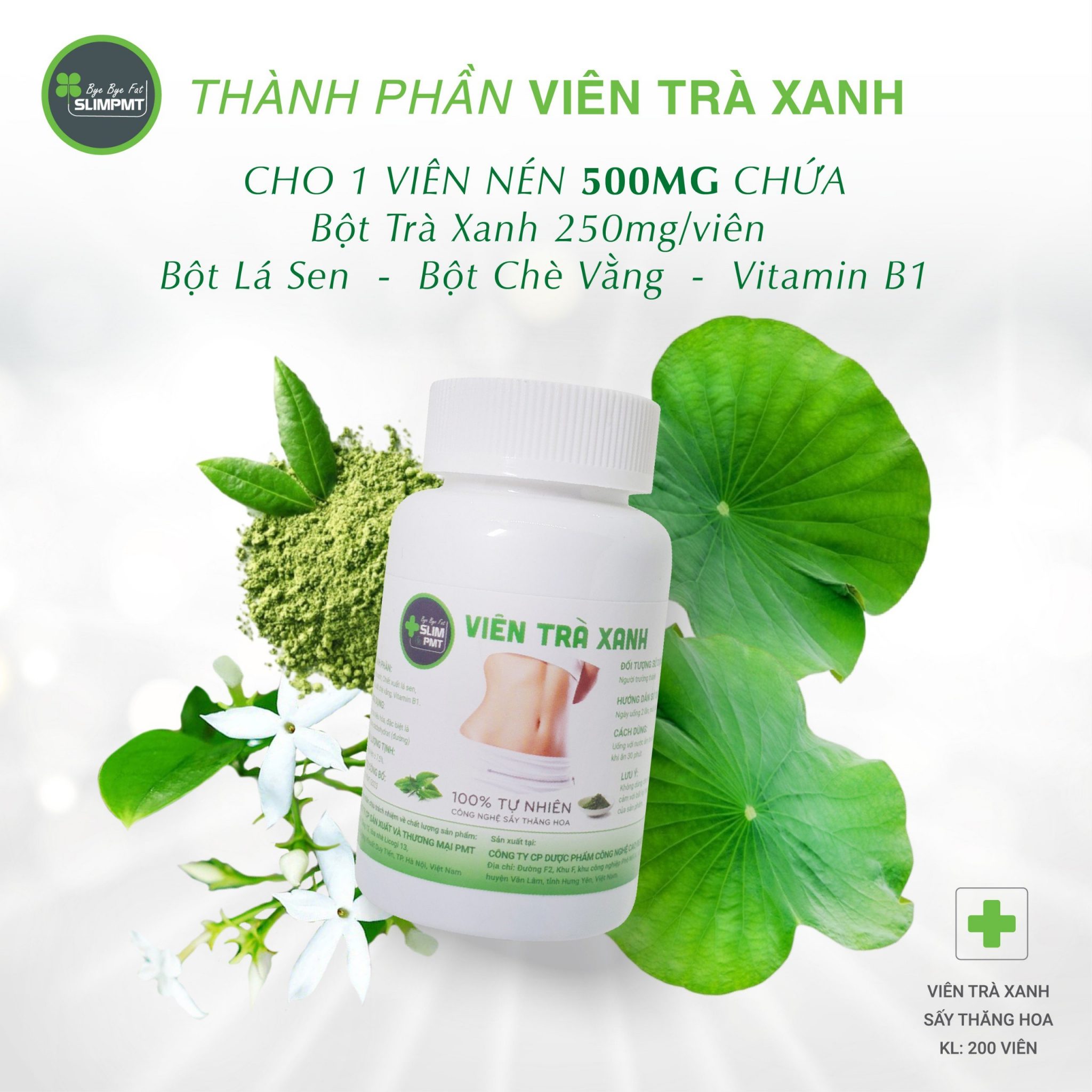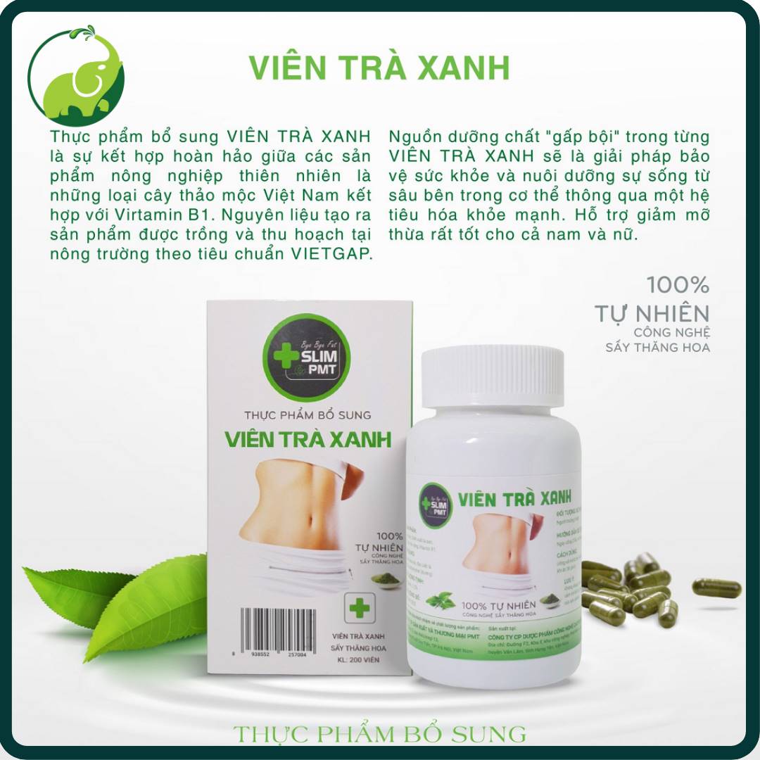 Viên trà xanh được sản xuất 100% từ trà xanh, bột lá sen, bột chè vằng, Vitamin B1.