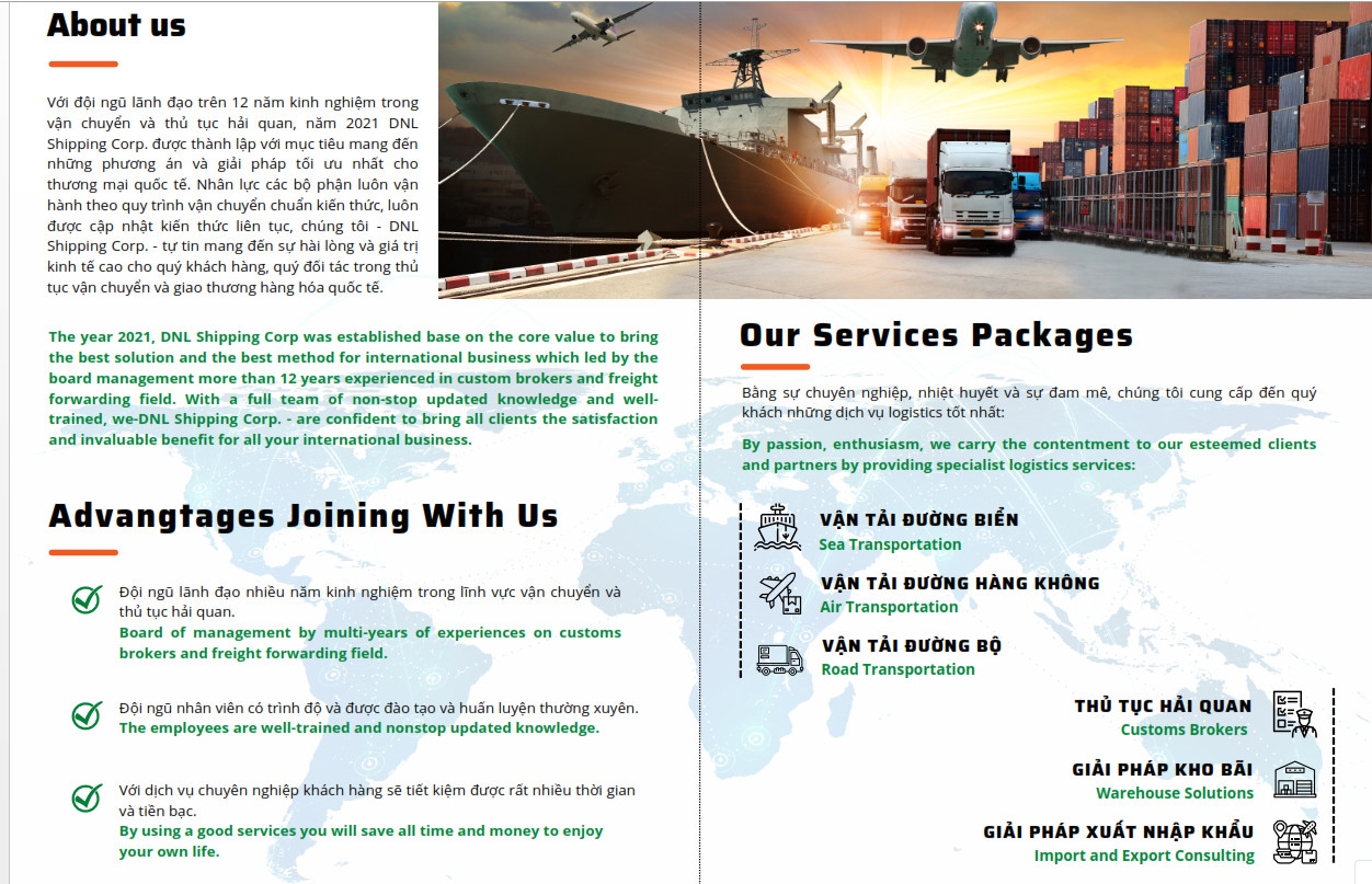 DNL Shipping được thành lập năm 2021 với mục tiêu mang đến những phương án và giải pháp tối ưu nhất cho thương mại quốc tế. Mặc dù DNL Shipping là doanh nghiệp mới nhưng với định hướng chiến lược của đội ngũ ban lãnh đạo dày dặn kinh nghiệm đã có trên 12 năm làm nghề trong lĩnh vực logistics, DNL Shipping đã từng bước vươn lên khẳng định vị trí của mình trong ngành logistics. Bỏ qua định kiến về doanh nghiệp mới, bằng tinh thần học hỏi, trau dồi kinh nghiệm DNL Shipping đã tạo được sự tín nhiệm với khách hàng thông qua chất lượng dịch vụ và bảo mật ngày càng được nâng cao.