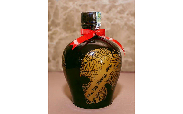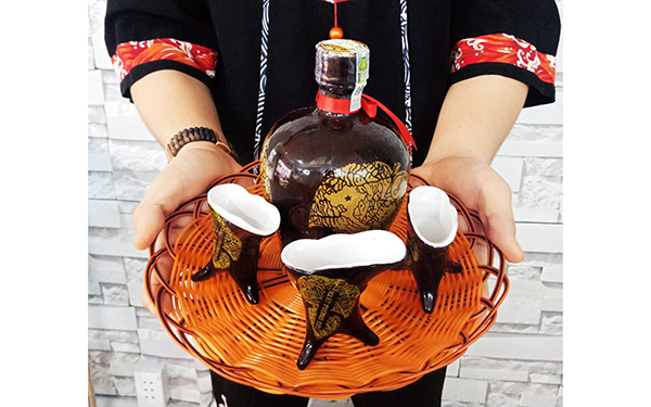 Rượu nếp nương Kiết Tường được đựng trong bình làm bằng chất liệu gốm sứ mặt trước được vẽ hoa mai vàng với thương thiệu Kiết Tường Tửu, mặt sau được vẽ họa tiết chiếc lá với nét vẽ rất tinh xảo.