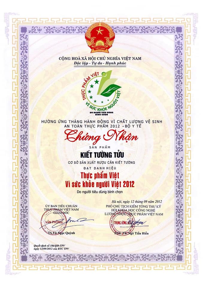 Trong thời gian có mặt trên thị trường Việt Nam, rượu nếp Kiết Tường đã được Hội Khoa học công nghệ lương thực thực phẩm Việt Nam tặng danh hiệu “Thực phẩm Việt vì sức khỏe người Việt 2012” do người tiêu dùng bình chọn và “Huy chương vàng và chứng nhận danh hiệu hàng Việt Nam chất lượng cao phù hợp tiêu chuẩn”.
