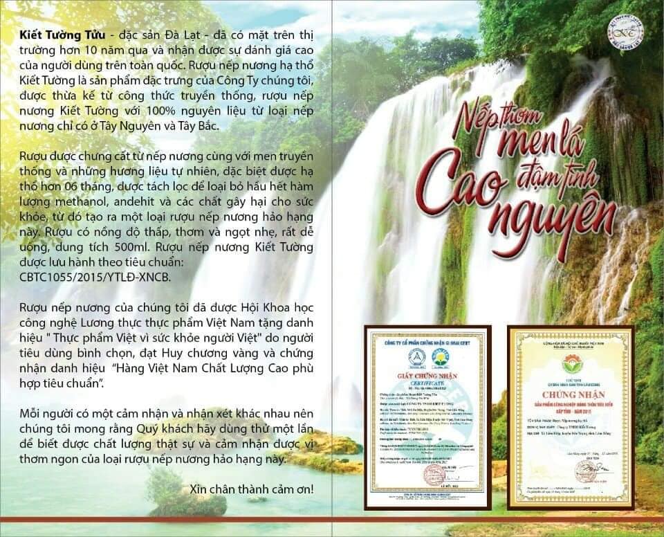 Rượu Nếp Nương Kiết Tường đã có mặt trên thị trường hơn 10 năm qua và nhận được sự đánh giá cao của người dùng tại thị trường Đà Lạt – Lâm Đồng. Sản phẩm rượu nếp Kiết Tường với 100% nguyên liệu từ nếp nương được tinh lọc và chưng cất cùng với men tự làm và những hương liệu thiên nhiên. Đặc biệt được hạ thổ dưới lòng đất trong thời gian tối thiểu 06 tháng, sau đó đưa qua bộ lọc trước khi đóng chai để tách và loại bỏ hầu hết hàm lượng methanol, andehit và các chất gây hại cho sức khỏe để tạo ra được một loại rượu an toàn cho sức khỏe người dùng.