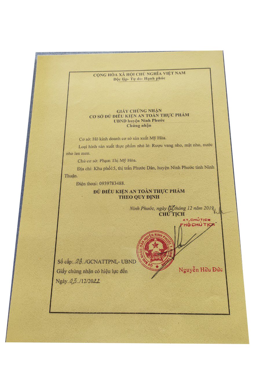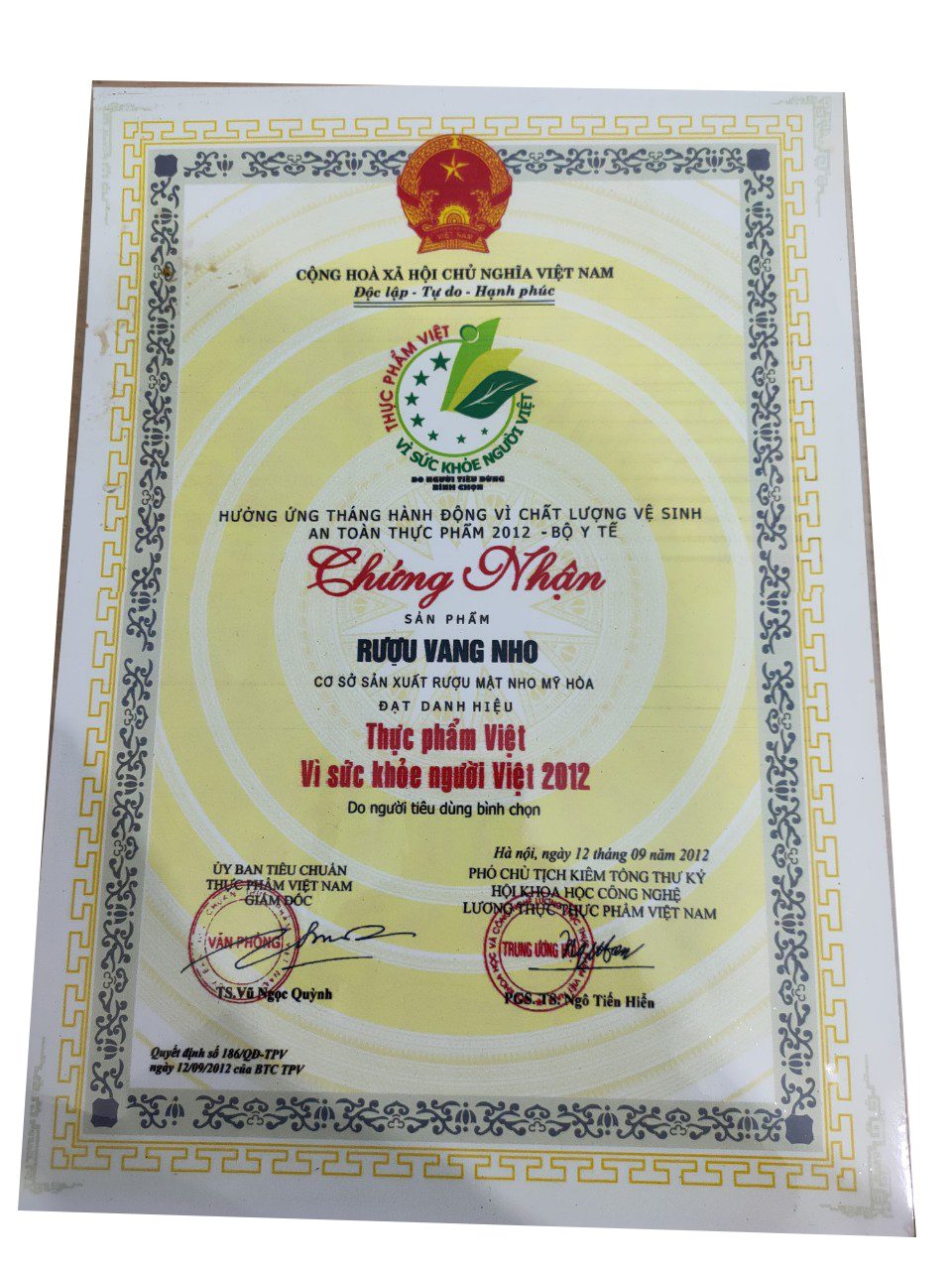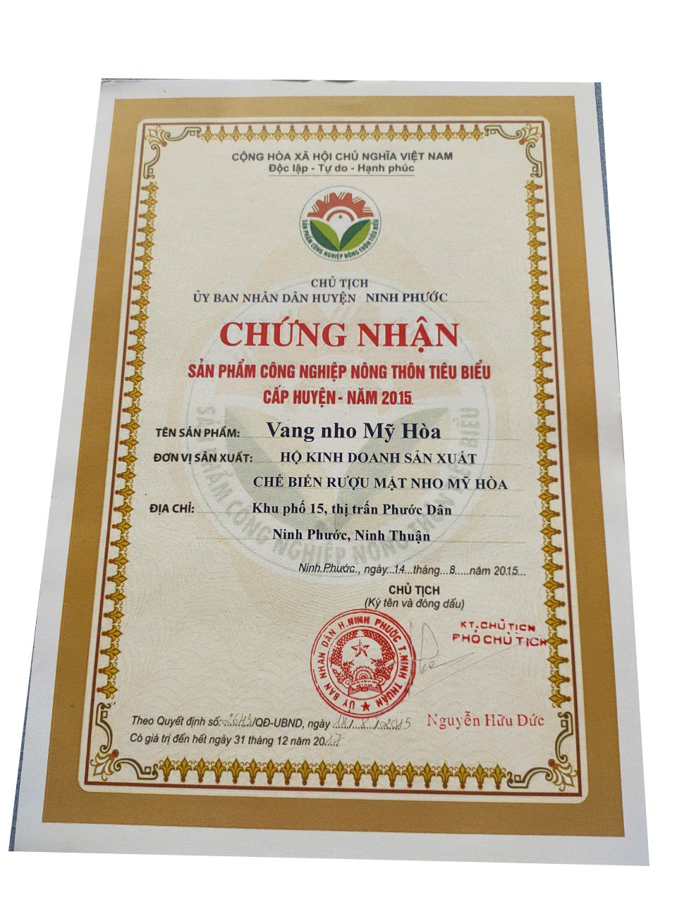 - Nhận được chỉ dẫn địa lý bảo hộ cho thương hiệu “rượu mật nho Mỹ Hòa” vào năm 2008.