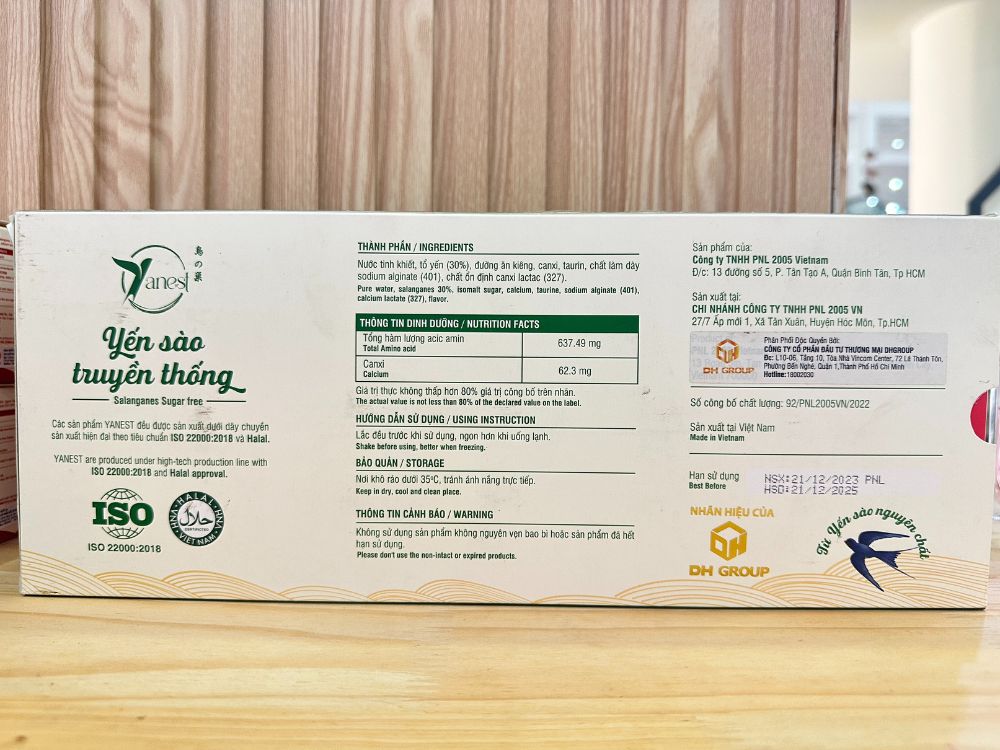 - Thành phần: Nước tinh khiết, tổ yến(30%), đường hữu cơ, canxi(0.7%), tautin(0.3%), chất làm dày sodium alginate (401), chất ổn định canxi lactac (327).