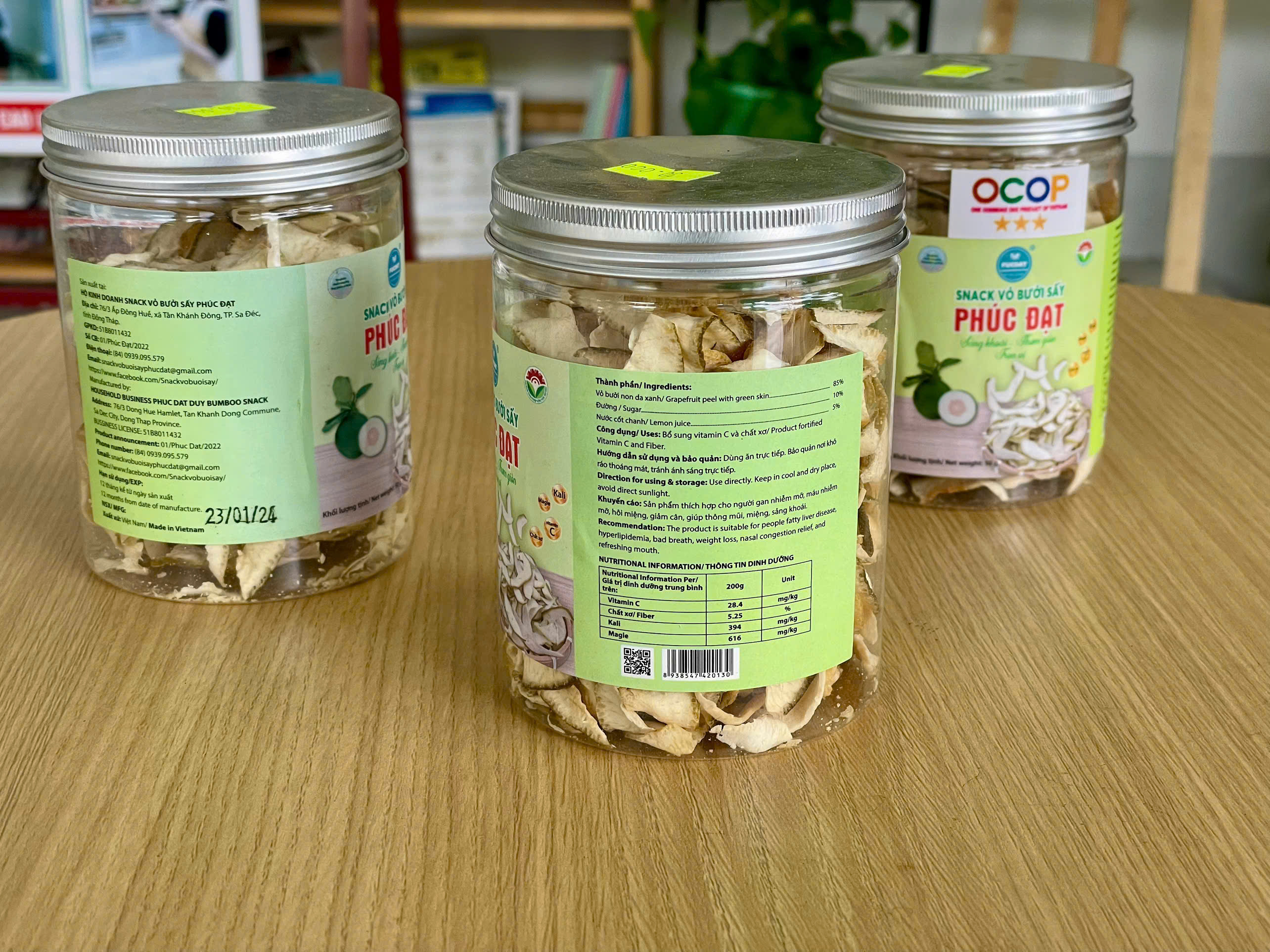 Snack Vỏ Bưởi Sấy Phúc Đạt là sản phẩm ăn vặt tự nhiên được chế biến từ vỏ bưởi tươi, trải qua quy trình sấy khô hiện đại, giữ nguyên hương vị và dưỡng chất của vỏ bưởi. Với hương vị thanh mát, giòn rụm, Snack Vỏ Bưởi Sấy Phúc Đạt không chỉ là món ăn vặt thơm ngon mà còn mang lại nhiều lợi ích cho sức khỏe.