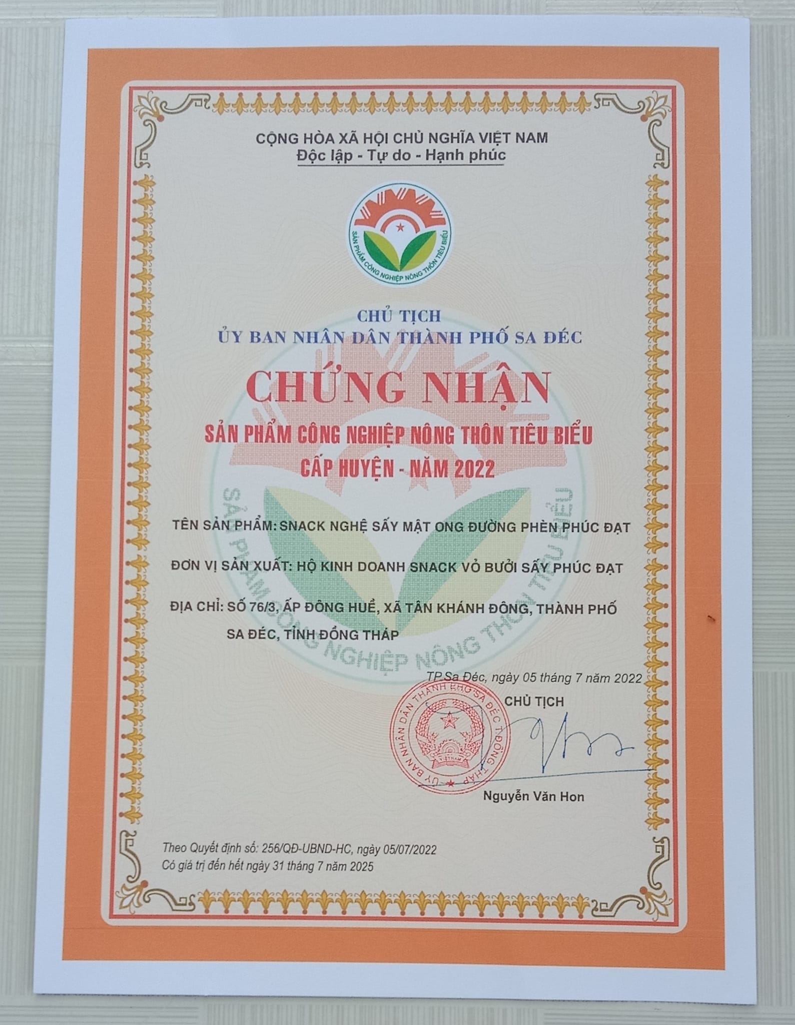 Là người con quê hương Đồng Tháp. Tôi, chủ cơ sở Phúc Đạt, hiểu rõ đặc trưng của địa phương và tiềm năng của các sản phẩm chế biến từ trái bưởi. Đồng thời, việc sản xuất snack vỏ bưởi sấy của tôi cũng góp phần giải quyết việc làm cho phụ nữ ở địa phương. Với tâm quyết và tinh thần khởi nghiệp, tôi mong muốn tạo ra những sản phẩm thật tốt phục vụ thị trường, mang lại sức khỏe cho người tiêu dùng và tạo thêm thu nhập cho người nông dân từ những trái bưởi non da xanh tuyển bỏ.