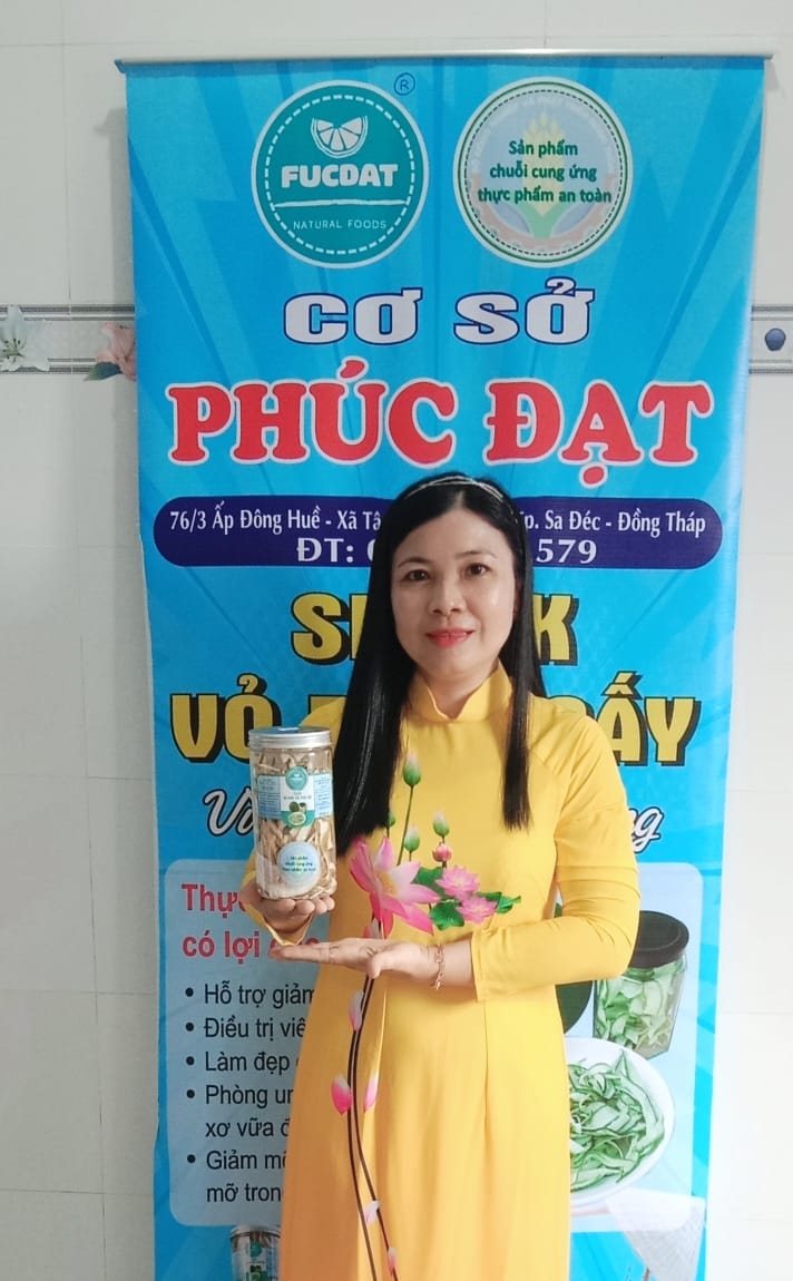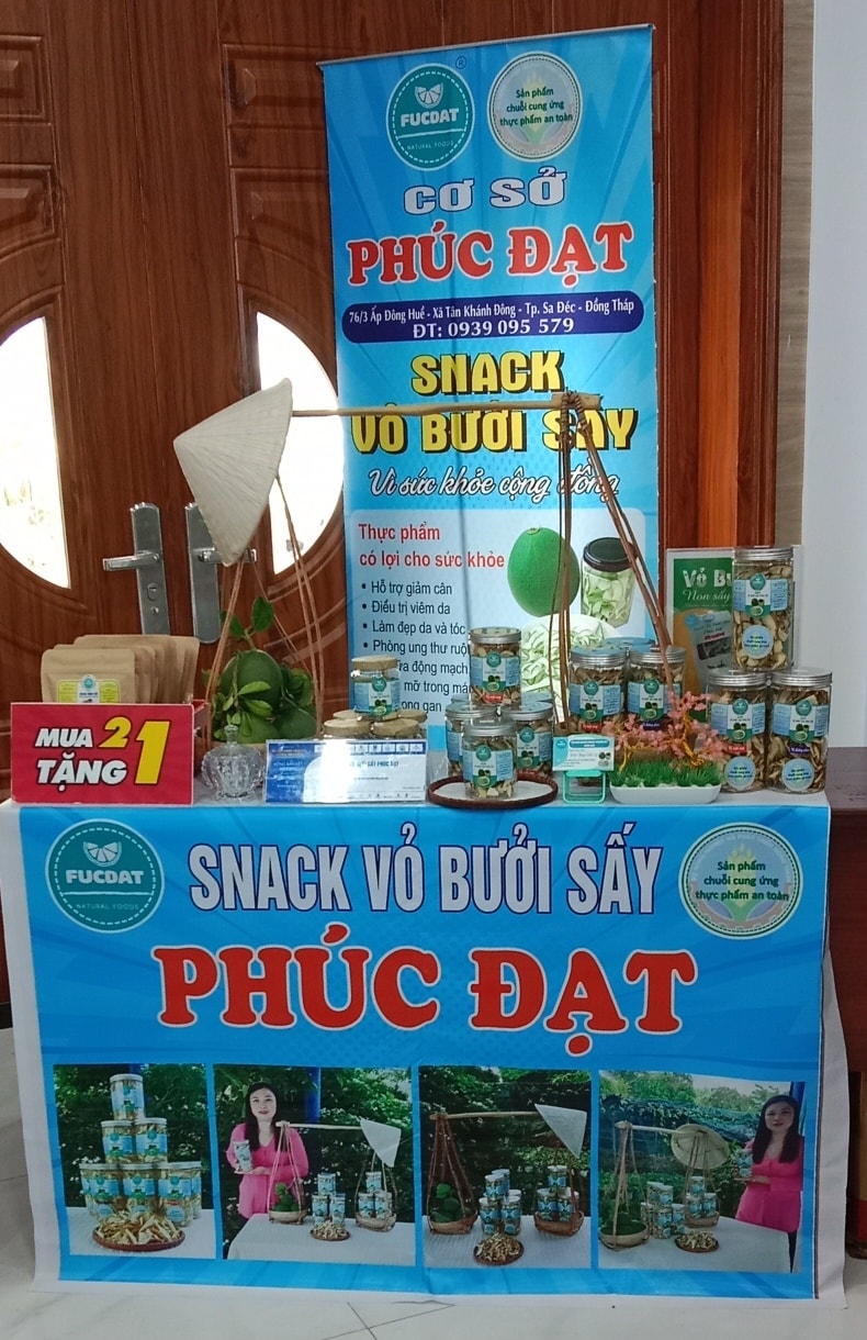 ĐTO - Từ sản phẩm bưởi da xanh có sẵn tại địa phương, chị Trần Thụy Hải Ly (sinh năm 1981) - chủ hộ kinh doanh snack vỏ bưởi sấy Phúc Đạt (xã Tân Khánh Đông, TP.Sa Đéc) đã mày mò để chế biến ra sản phẩm bưởi sấy giòn giúp bảo vệ sức khỏe người tiêu dùng và nâng cao giá trị tài nguyên bản địa. Sản phẩm snack vỏ bưởi sấy Phúc Đạt cũng góp phần đa dạng hóa các sản phẩm du lịch cho làng hoa Sa Đéc.