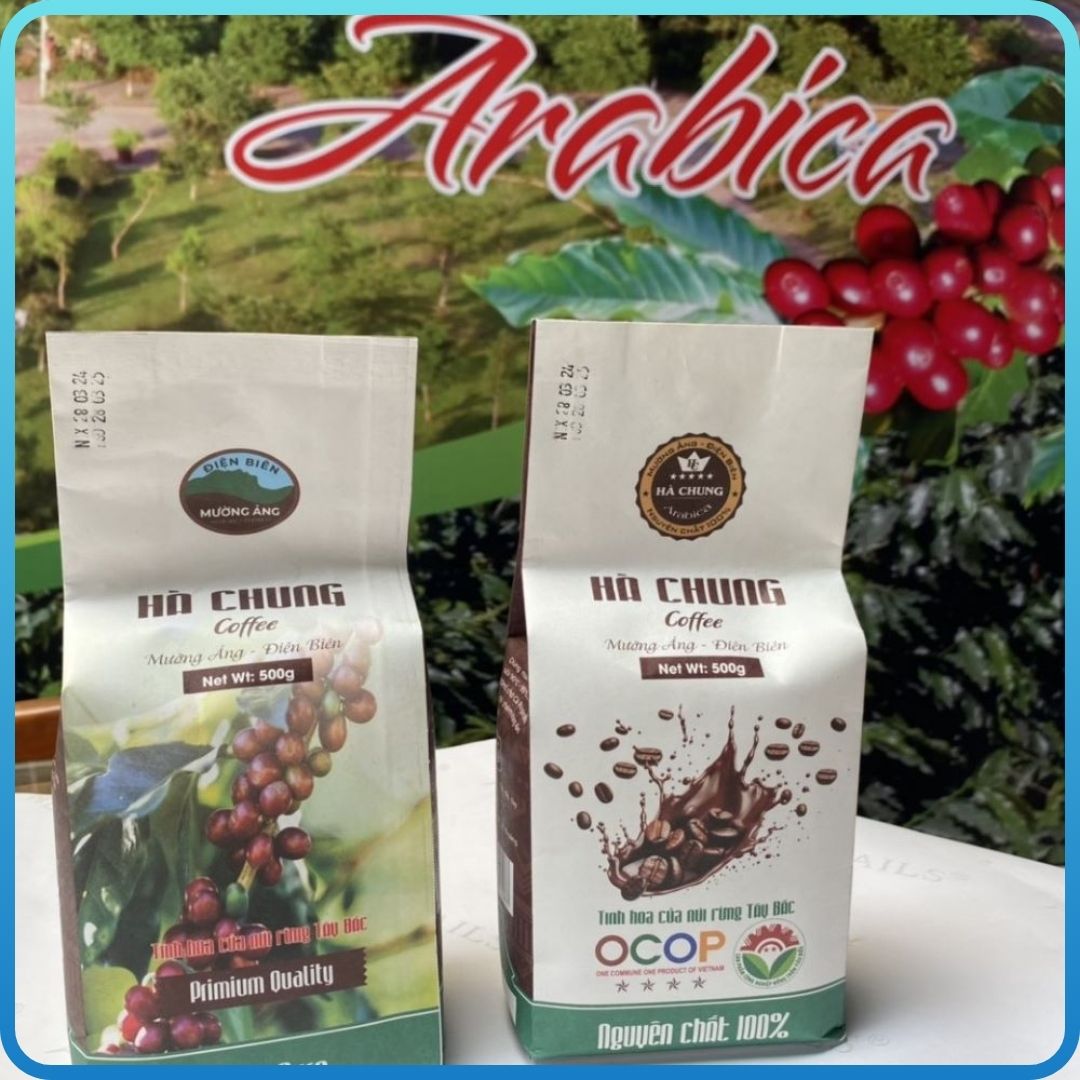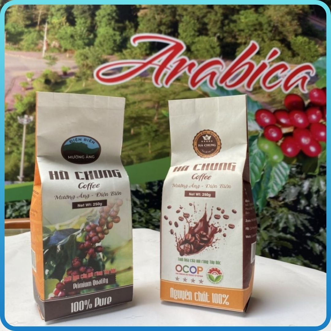 Cà Phê Bột Hà Chung là sản phẩm OCOP 4 sao của tỉnh Điện Biên, được sản xuất và chế biến hoàn toàn từ hạt cà phê nguyên chất vùng Mường Ảng. Cơ sở chế biến cà phê Hà Chung cam kết mang đến một sản phẩm chất lượng cao, mang hương vị đậm đà và độc đáo nhờ thổ nhưỡng tự nhiên đặc biệt của vùng đất này. Cà phê Hà Chung được chế biến cẩn thận để đảm bảo mùi thơm và vị ngon đặc trưng, mang đến trải nghiệm thưởng thức cà phê đỉnh cao cho người dùng.