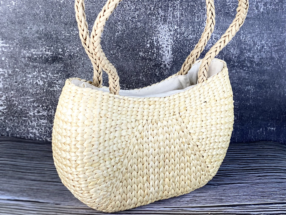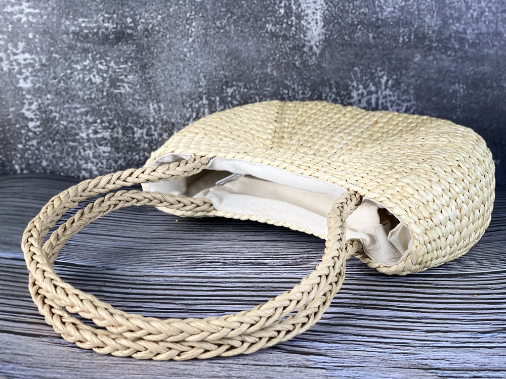 - Thành phần: Chất liệu sợi lục bình, có vải lót, khoá kéo, đan hoàn toàn thủ công, tự nhiên.