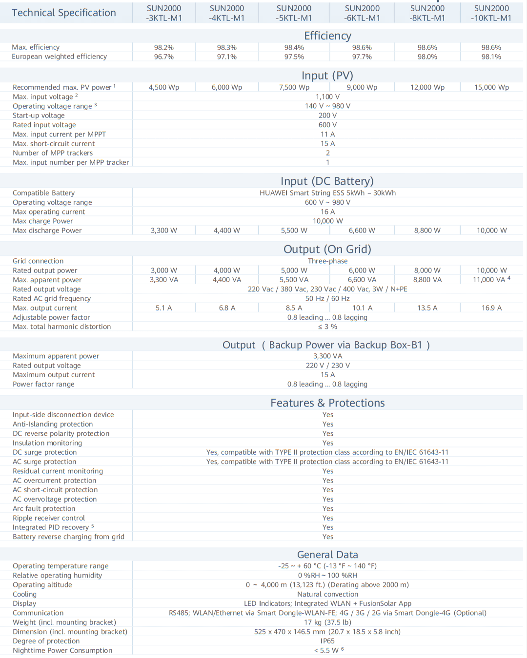 Datasheet của biến tần hoà lưới Inverter Huawei 10kW SUN2000-10KTL-M1: